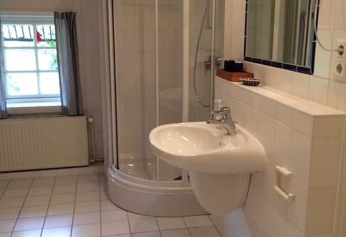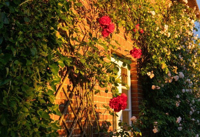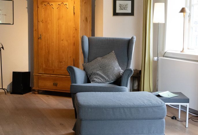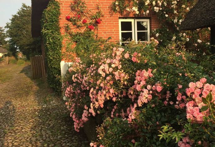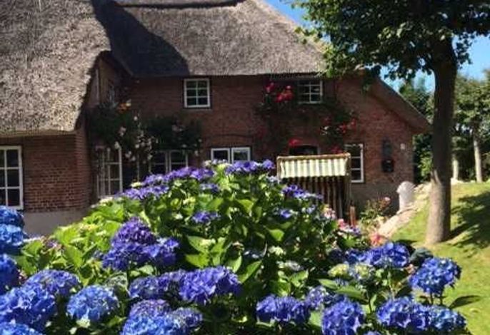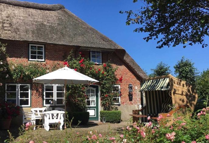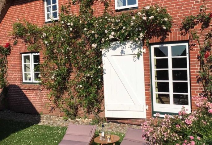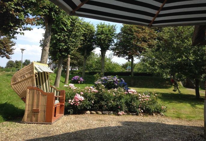 • Ihr eigener Strandkorb, umgeben von einem alten Friesenwall und gemütlichen Gartenmöbeln in unserem Rosengarten.