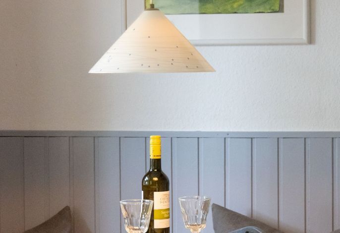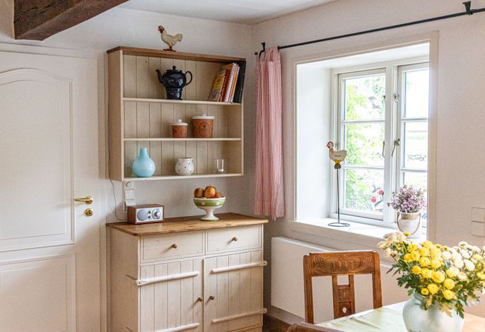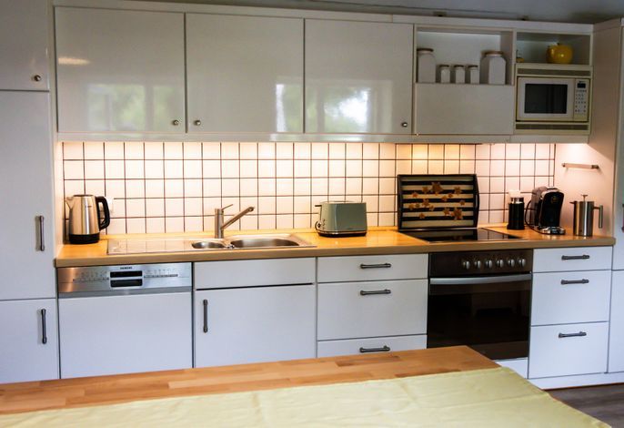 • Moderne Ausstattung mit Cerankochfeld, Backofen, Mikrowelle und Geschirrspüler.