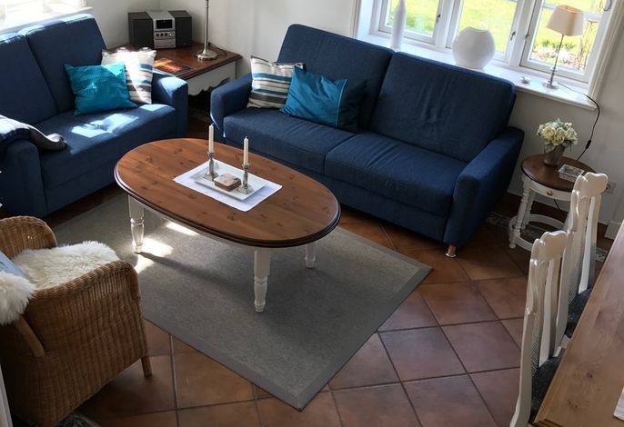 Der helle Wohnbereich bietet Ihnen zwei gemütliche Sofas und einen Sessel. Für Unterhaltung sorgen Kabel-TV, DVD-Player, HiFi-Anlage, auch ein Telefon ist hier vorhanden.