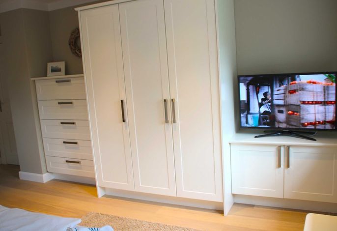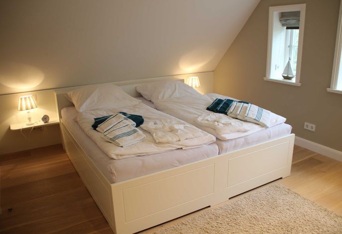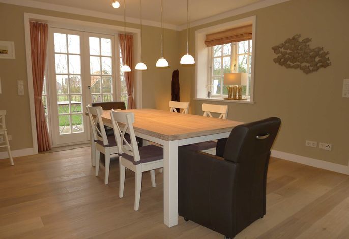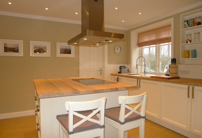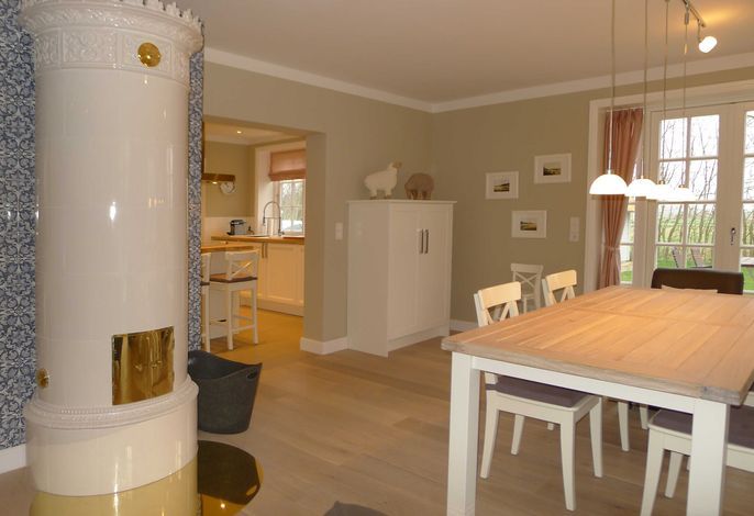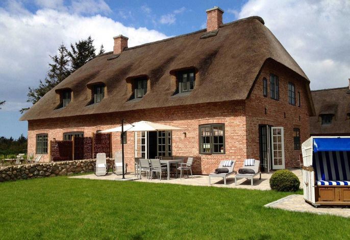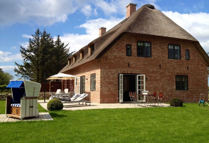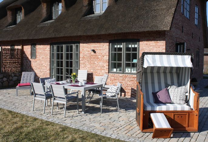 Freuen Sie sich auf eine sehr großzügige, komfortable Doppelhaus-Hälfte mit vielen friesischen Elementen. Außen u.a. Reetdach, rotes Mauerwerk, Holzsprossenfenster, Friesenwall, Strandkorb, Reetdach-Gartenhütte und einer Terrasse an 2 Seiten des Hauses. Innen z. B. vom Inseltischler gefertigte, einzigartige Innentüren und weiße Einbaumöbel in nahezu allen Räumen. Sowie ein historischer Mylin-Ofen vor einer friesisch blauen Kachelwand, hochwertige Böden und Treppen aus Eiche, eine maßgefertigte Friesen-Küche mit großer Kochinsel, hochwertige, edle Einbaugeräte und einen separaten Vorratsraum.
