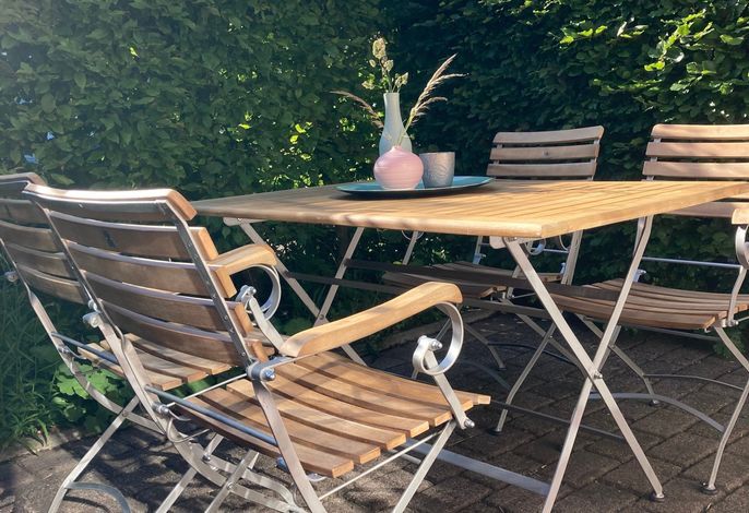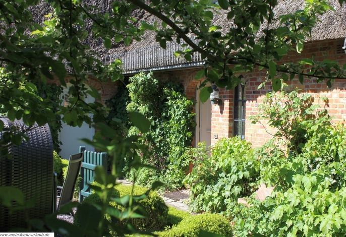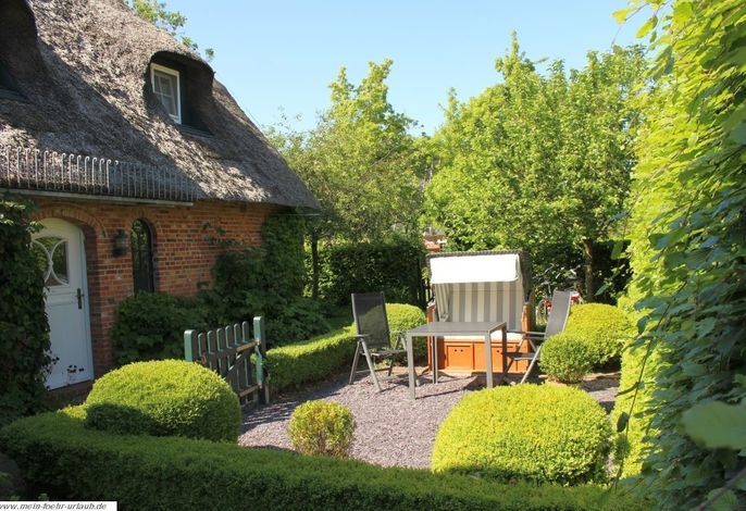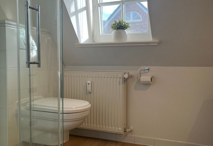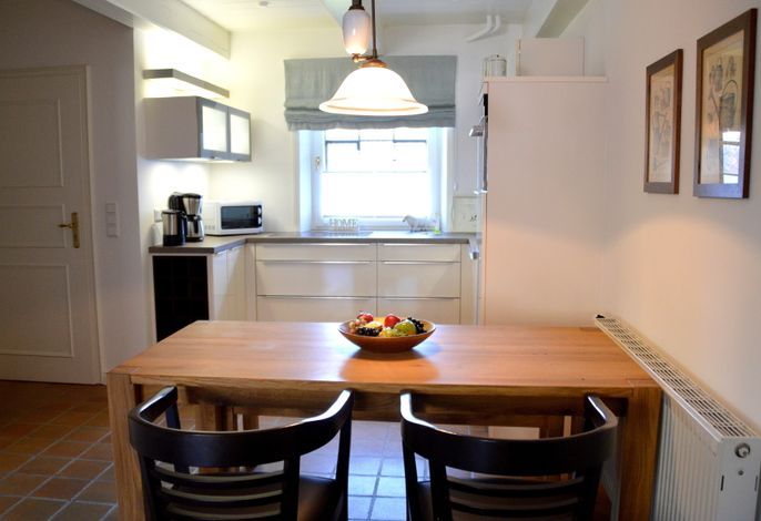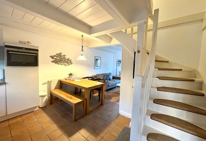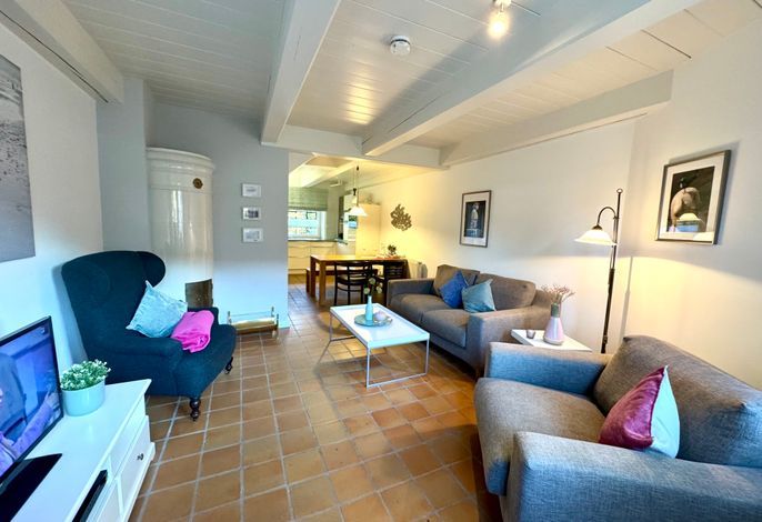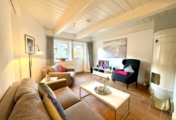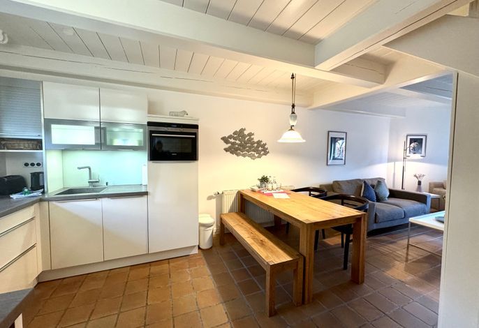 Die gemütlich eingerichtete Wohnung verbindet auf ca. 65 m² modernen Komfort mit historischem Ambiente. Über die Eingangsdiele erreichen Sie die offene Wohnküche (ausgestattet mit Geschirrspüler, Backofen/Mikrowelle) mit angrenzendem Wohnbereich. Von hier haben Sie direkten Zugang zur sichtgeschützten Westterrasse. Gegenüber der Eingangstür finden Sie eine weitere Terrasse mit Strandkorb.