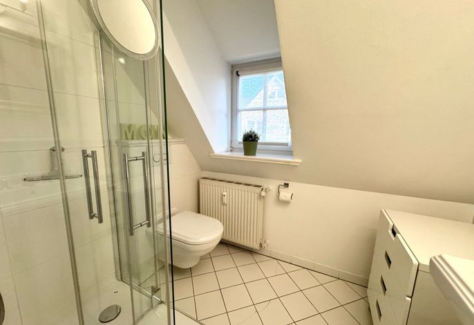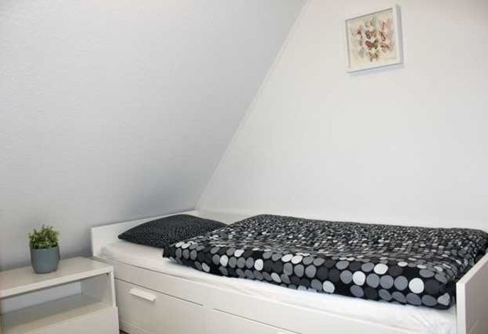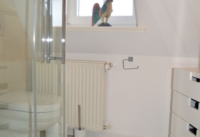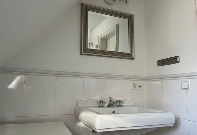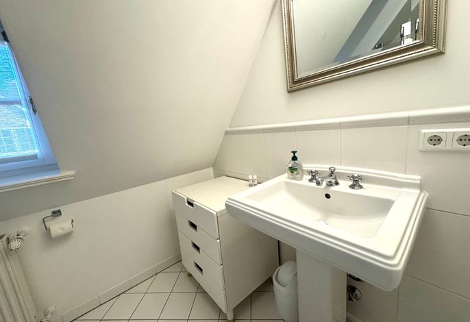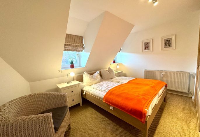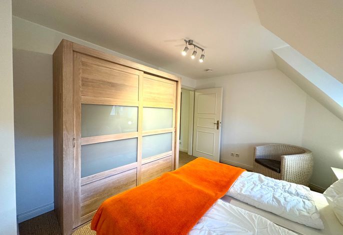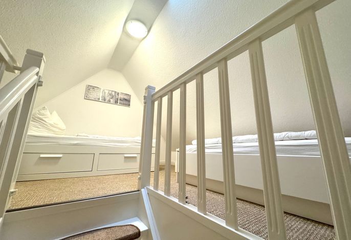 Im ersten Obergeschoss befinden sich das Badezimmer mit Duschbad, ein Flur sowie das Schlafzimmer mit Doppelbett und großem Schrank. Über eine Treppe gelangen Sie in ein weiteres Schlafzimmer mit zwei Einzelbetten. Dieser Spitzbodenbereich ist als offene gemütliche Galerie gestaltet.