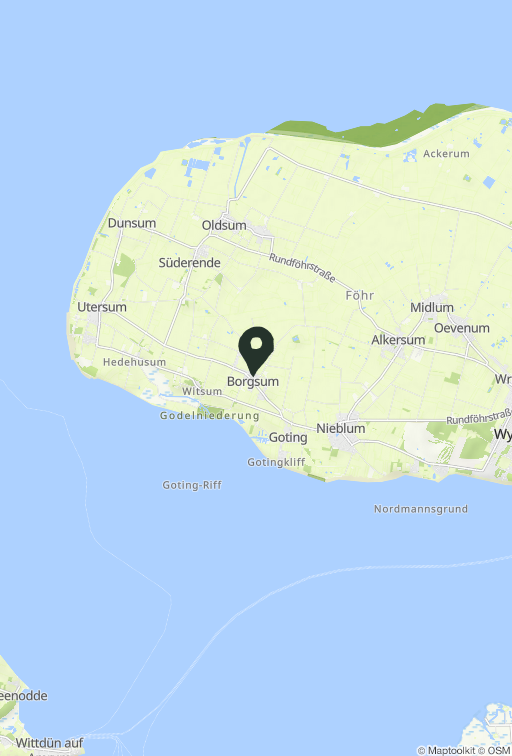 Die Ferienwohnung liegt im Dorfkern des Friesendorfes Borgsum. Das gemütliche Friesendorf lädt Sie auf der Marschseite zu Spaziergängen und Fahrradtouren ein, auf der anderen Seite sind in wenigen Minuten die Strände von Nieblum und Utersum zu erreichen. In unmittelbarer Nähe zur Ferienwohnung befinden sich ein Bäcker, ein Fahrradverleih, ein Café sowie ein Restaurant und für unsere kleinen Gäste ein Spielplatz. Einen der schönsten Golfplätze Norddeutschlands (27-Loch Anlage) finden Sie in ca. 5 km Entfernung. Weitere Einkaufsmöglichkeiten und Restaurants finden Sie im nur 2 km entfernten Nachbardorf Nieblum.