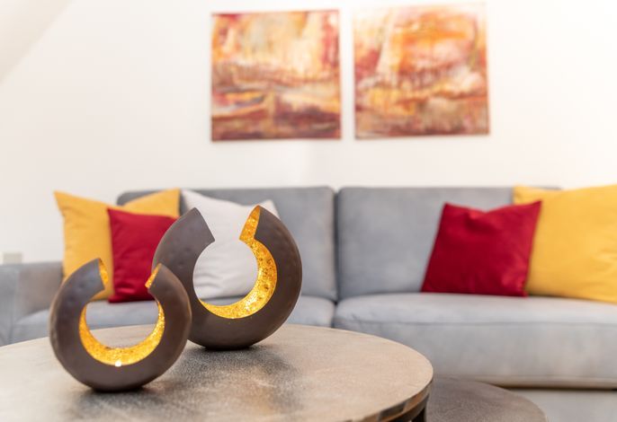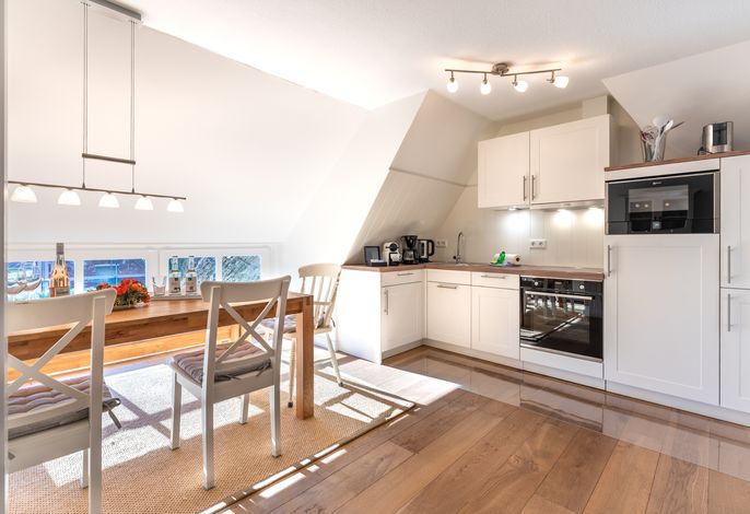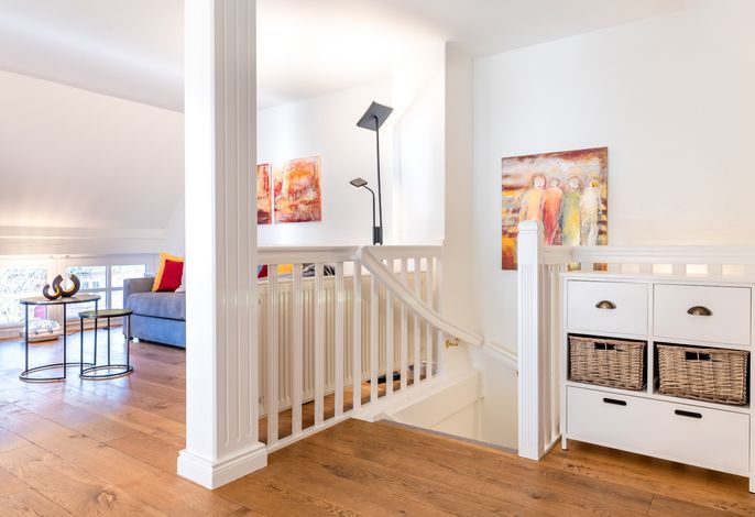 Über eine Treppe gelangt man in den, als offene Galerie gestalteten, wohnlich ausgebauten Spitzboden. Ein Rückzugsort zum Arbeiten am Schreibtisch mit weitem Blick über die Marsch Richtung Nieblum oder schlicht zum Ausruhen.