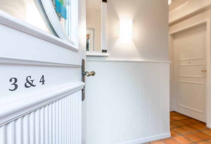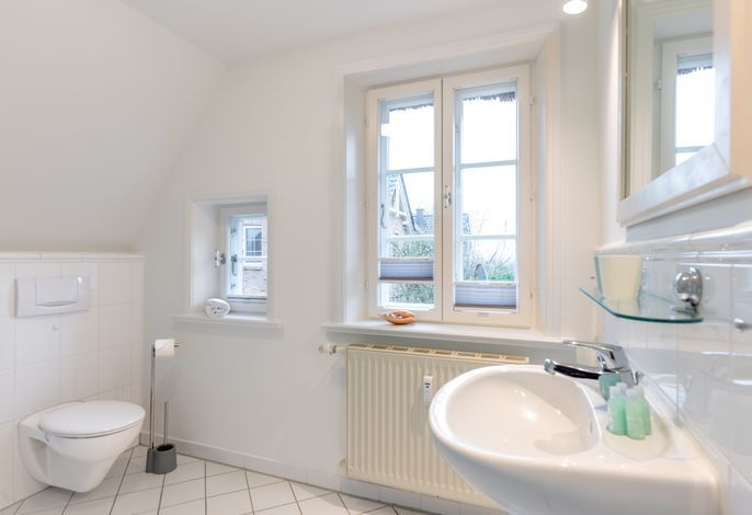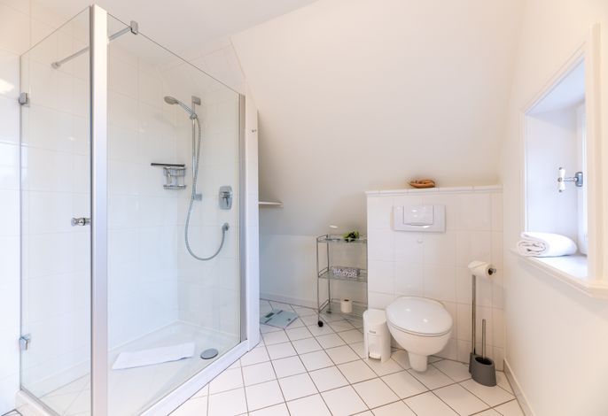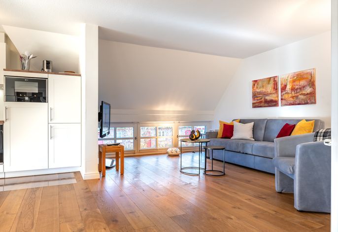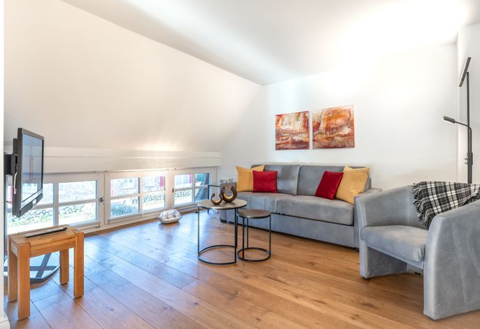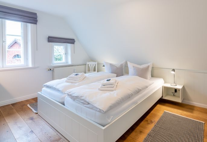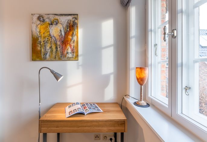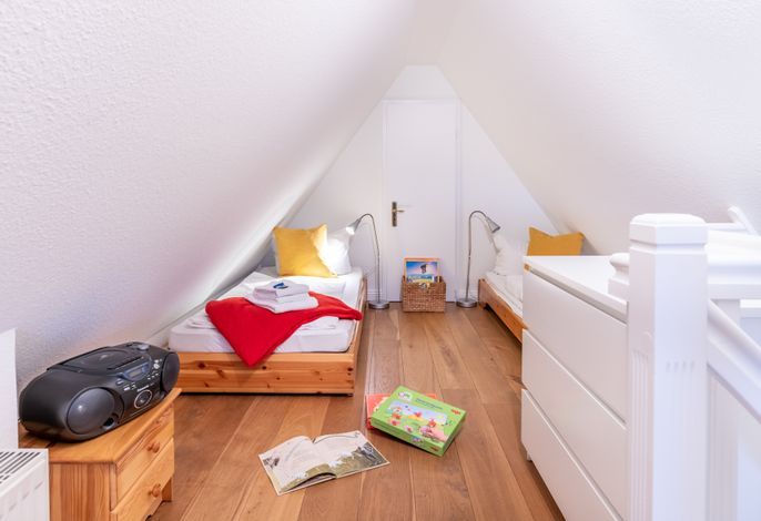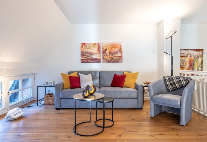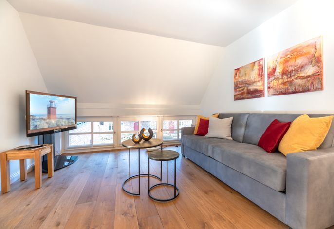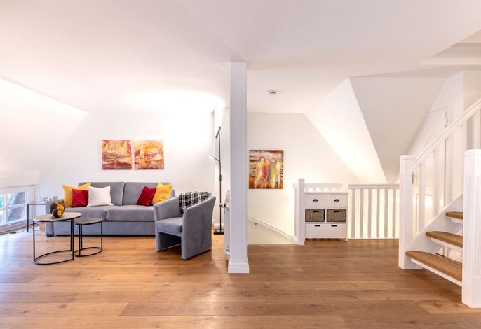 Über eine Treppe gelangt man in den, als offene Galerie gestalteten, wohnlich ausgebauten Spitzboden. Ein Rückzugsort zum Arbeiten am Schreibtisch mit weitem Blick über die Marsch Richtung Nieblum oder schlicht zum Ausruhen.