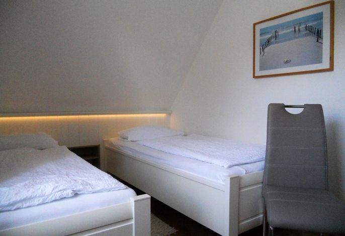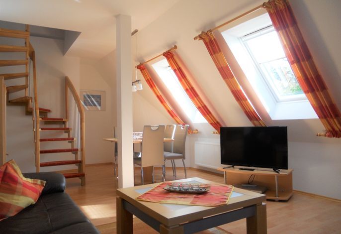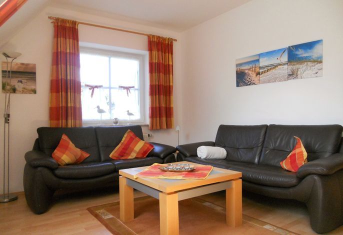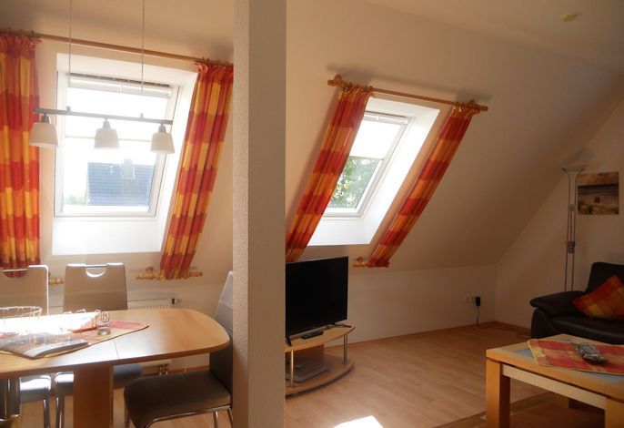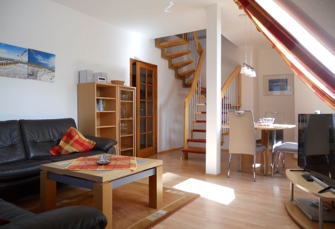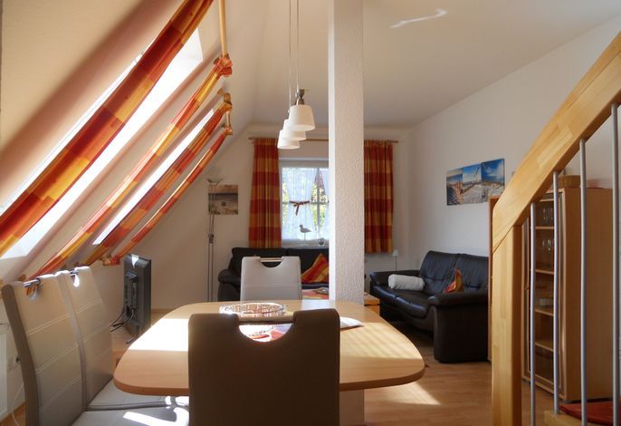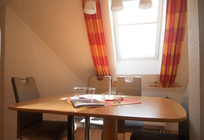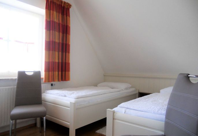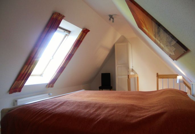 Im Herzen von Wyk gelegen, befindet sich in ruhiger Lage unser Domizil Rugstieg 8 mit seinen 4 Ferienwohnungen für 2 bis 5 Personen. Die Wohnungen des Hauses sind allergiker- und kinderfreundlich eingerichtet. Unsere Wohnung Rugstieg 8/4 erstreckt sich über das erste und zweite Obergeschoß und bietet bis zu 4 Personen genügend Platz für herrliche Urlaubstage. Das gemütlich eingerichtete Wohnzimmer ist liebevoll gestaltet und technisch gut ausgestattet mit WLAN, Telefon, Stereoanlage, Flachbild-TV und DVD-Player. Hier befindet sich auch der Essplatz neben der Treppe, die hinaus zum offenen Dachgeschoss-Schlafzimmer mit Doppelbett führt. Auf der ersten Etage befindet sich weiterhin ein Schlafzimmer mit zwei Einzelbetten, das Bad mit Dusche und Föhn sowie die separate Küche mit Ceranfeld-Herd und Backofen, Geschirrspüler, Mikrowelle und vielem mehr. Probieren sie doch mal friesische Gerichte in Ihrem Urlaub aus. In der Wyker Innenstadt finden Sie freundliche Buchhändler, die schöne friesische Kochbücher anbieten. Im Untergeschoss des Hauses befindet sich eine Sauna mit einigen Fitnessgeräten sowie Waschmaschine und Trockner zur gemeinsamen kostenfreien Nutzung. Das gepflegte Haus mit dem idyllischen Garten liegt wenige Meter vom Wyker Stadtwädchen mit dem Abenteurspielplatz Löwenhöhle entfernt und lädt somit Jung und Alt zum Spazierengehen und Verweilen ein. In ca. 10 Gehminuten erreichen Sie den Strand und das Meer sowie die Fußgängerzone mit zahlreichen Cafés, kleinen Geschäften und Restaurants. Schauen Sie sich die Wohnungen an und überzeugen Sie sich selbst! Wir freuen uns auf Ihren Anruf.