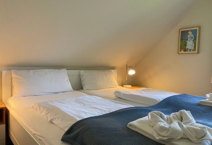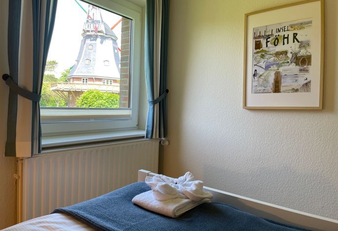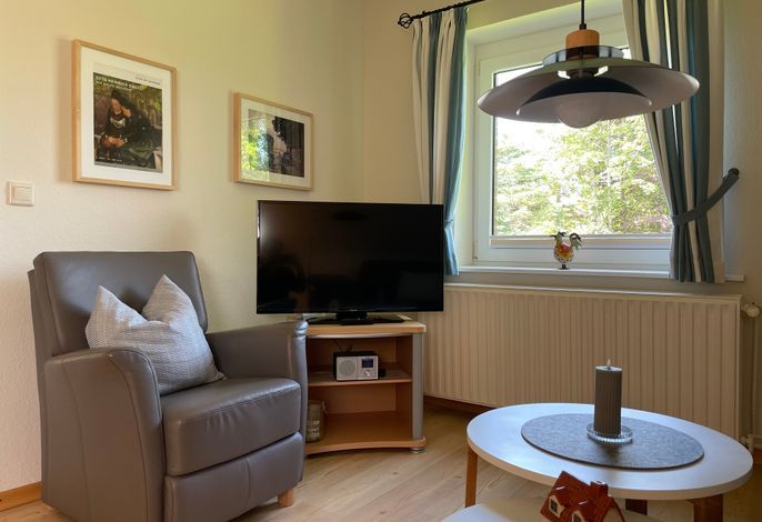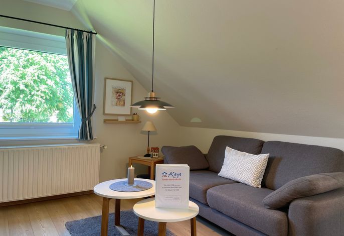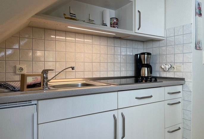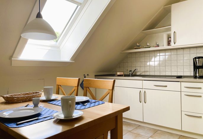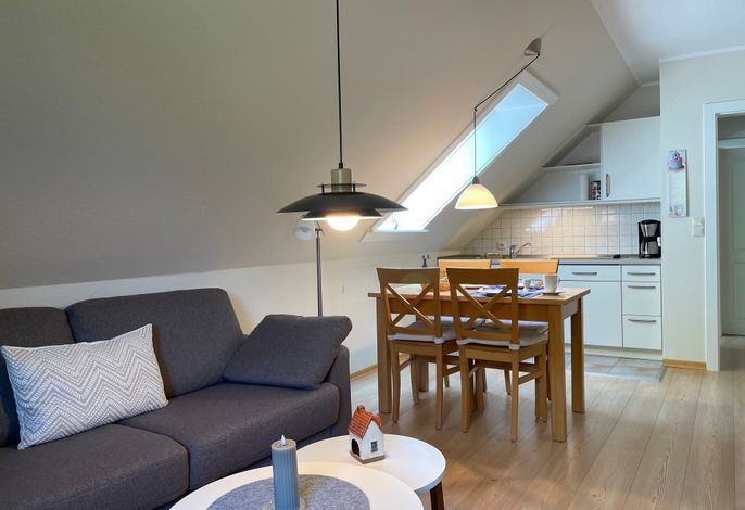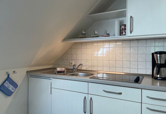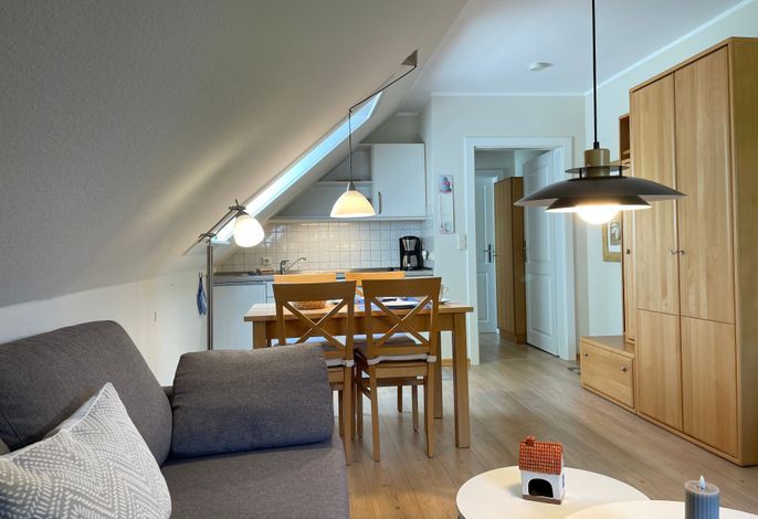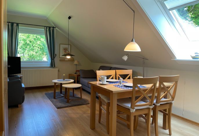 Die Wohnung Rungholt bietet auf ca. 40 qm Platz für 2 Personen und befindet sich in der ersten Etage. Der offene Wohnraum mit einer bequemen Couch und einem gemütlichem Sessel schließt an die gut ausgestattete Küchenzeile an und lädt zum Verweilen ein. Die Küchenzeile mit Ceranfeld, Kühlschrank mit Gefrierfach und natürlich einer Kaffeemaschine wird durch eine großzügige Essgruppe ergänzt. Warme Holztöne und liebevolle Accessoires runden das Ambiente ab. Vom Schlafzimmer aus schauen Sie direkt auf die Wyker Windmühle. Das Schlafzimmer mit einem Doppelbett in Komforthöhe und einem geräumigen Kleiderschrank ist einladend und freundlich gestaltet. Vom Flur gelangen Sie in das hellgeflieste Badezimmer, welches mit einer Dusche und einem Fenster ausgestattet ist. Eine herzliche Gastfreundschaft erwartet Sie und wir freuen uns auf Ihren Besuch!
