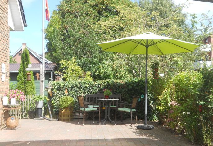 Im Garten befindet sich zur gemeinsamen Nutzung eine Sitzgelegenheit für die Wohnungen Störtebecker und Rungholt.
