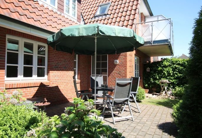 Ferienwohnung in Wyk auf Föhr, Rungholtstraße 3c, Wohnung Nr.2 3-Zimmer-Nichtraucherwohnung (ca. 65 qm) im Erdgeschoss mit Südterrasse und kleinem Garten. WOHNZIMMER: 3er Couch und 1 Sessel und 1 Hocker mit Couchtisch, Esstisch...