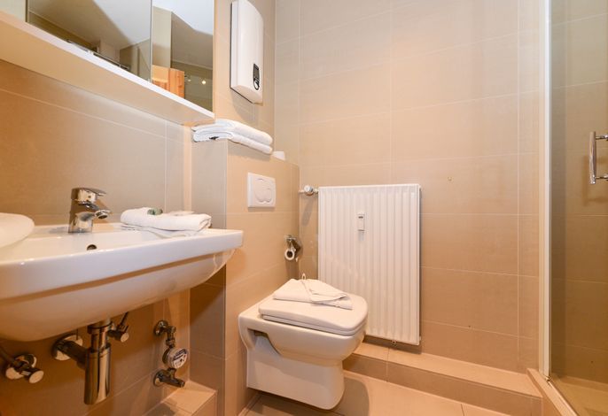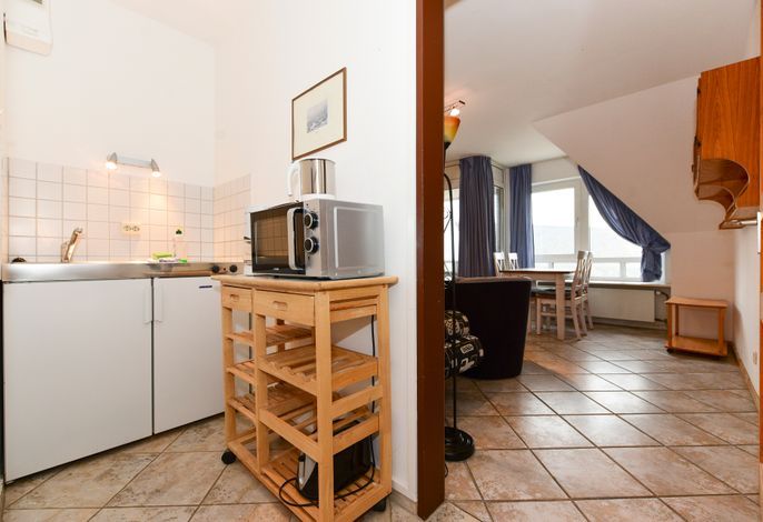 Eine kleine Küchenecke ermöglicht es, kleine Mahlzeiten zuzubereiten, und das Duschbad bietet modernen Komfort.