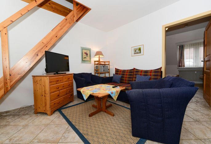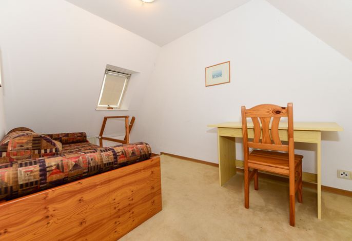 Eine offene Holztreppe führt in das Dachgeschoss, wo sich ein weiteres Schlafzimmer mit zwei Einzelbetten befindet.