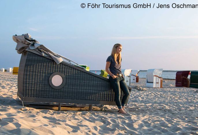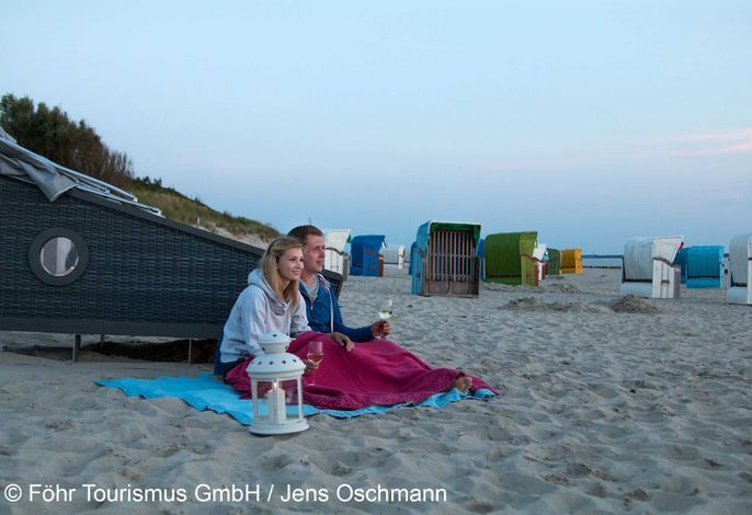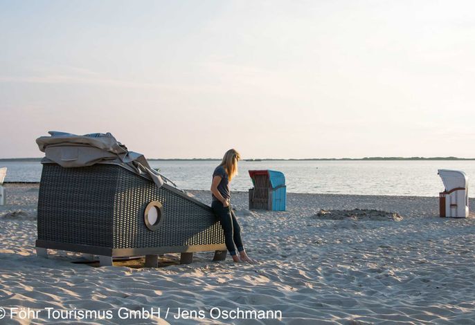 Sind Sie bereit für ein unvergessliches Schlaferlebnis mit Meeresrauschen? Dann haben Sie die Möglichkeit den Schlafstrandkorb in Utersum für 1 Nacht zu buchen und Sie genießen mit grandiosem Blick auf die beiden Nachbarinseln Amrum und Sylt einen traumhaft schönen Sonnenuntergang. Nirgendwo sonst können Sie in Utersum näher am Wasser übernachten!