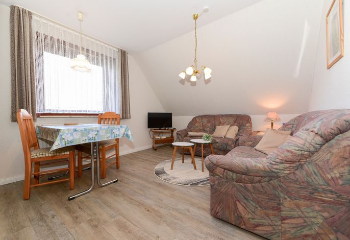 Das Wohnzimmer dieser Wohnung empfängt Sie freundlich mit einer gemütlichen Sitzecke und bietet Platz für entspannte Stunden.