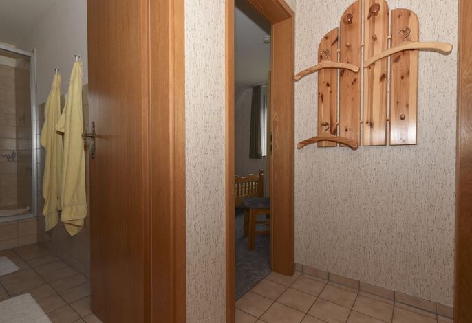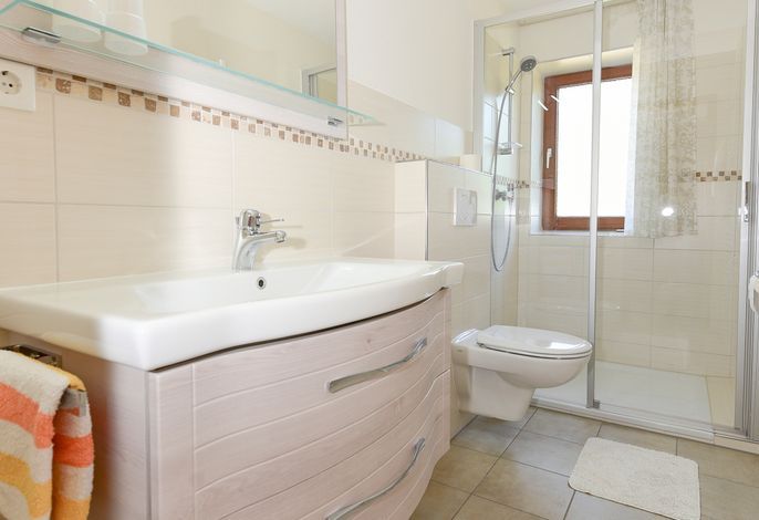Vom Flur aus gelangen Sie in das Duschbad, das in warmen Tönen gefliest ist und über ein Außenfenster für viel Licht und frische Luft verfügt.