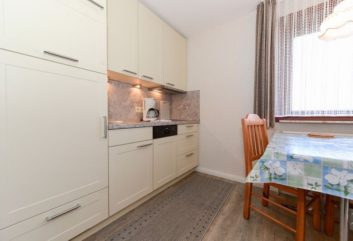 Offen in den Wohnraum integriert ist die moderne Küchenzeile mit kleinem Essbereich.
