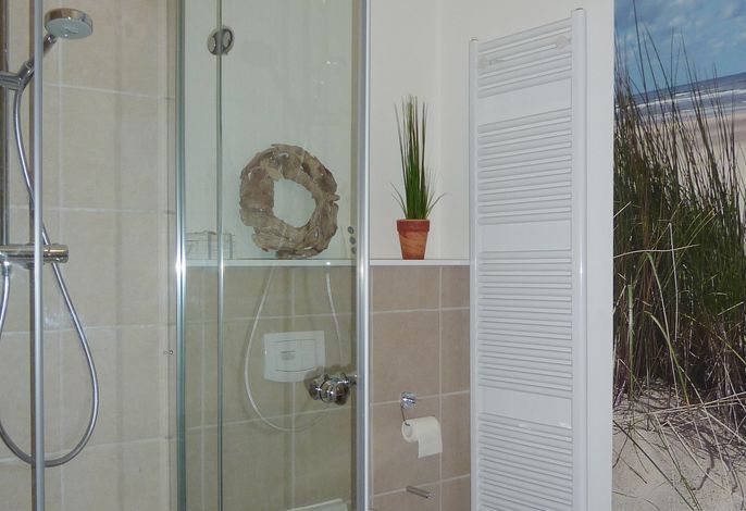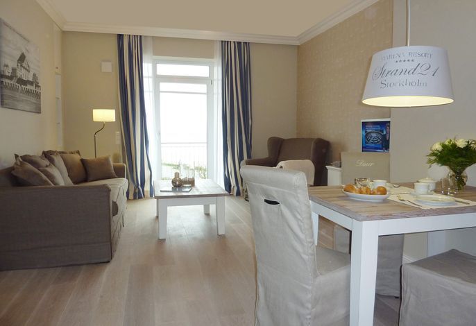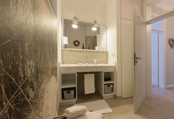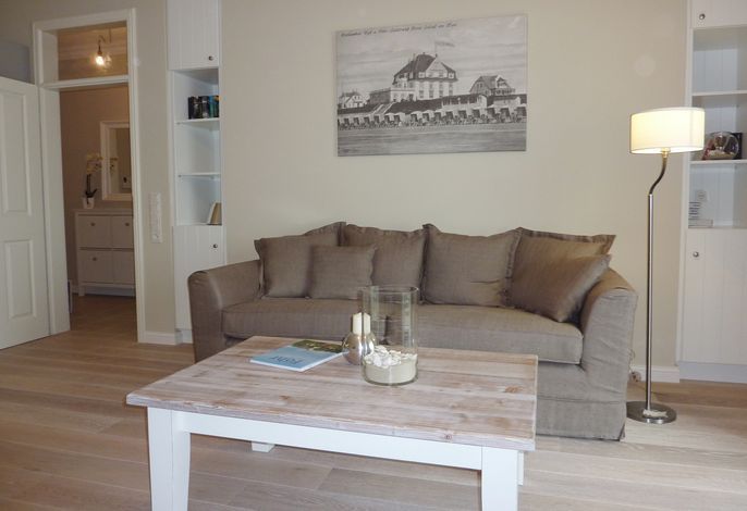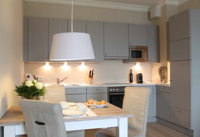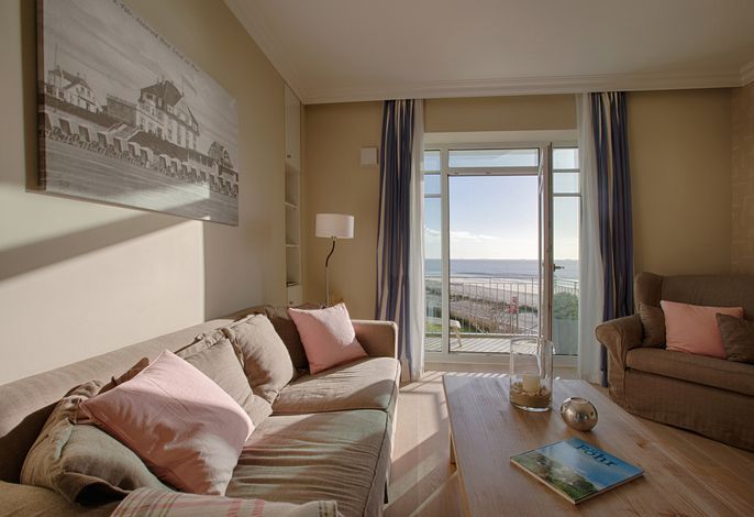 Diese exklusive Wohnung liegt im 2. OG hinter historischer Fassade, die beim Neubau erhalten geblieben ist. Sie bietet vom Wohn-, Schlaf- und Essbereich einen wunderschönem Blick auf den Strand, die Nordsee und die Halligen. Die helle 2-Zimmerwohnung ist u.a. mit hochwertigen Einbauschränken, moderner Landhaus-Küche, einer Rain Air Dusche und einem überlangen Bett ausgestattet. Italienische Fliesen [&] Eichenparkett mit Fußbodenheizung sowie die Einrichtung im Riviera Maison Stil schaffen eine Wohlfühlatmosphäre. Der windgeschützte Süd-Ostbalkon (über 10qm) bietet eine Sonnenliege und zwei Sessel zum Träumen. Nach einem langen Urlaubstag entspannen sie in der hauseigenen Sauna und lassen Ihre Seele baumeln.
