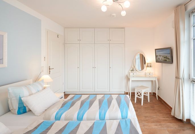 Wir begrüßen Sie im Schloß am Meer, der exklusiven Wohnanlage direkt am Wyker-Südstrand gelegen. Ihre Wohnung liegt im 2.Obergeschoss. Hier haben Sie einen Süd-Balkon ganz für sich allein und einen Blick auf die Nordsee und die Halligen. Dieser einzigartige Panoramablick ist unvergesslich. In nur wenigen Schritten befinden Sie sich auf der Promenade, die Sie ins Herz von Wyk führt. Hier laden Geschäfte zum Bummeln ein, Cafes und Restaurants verwöhnen Sie mit kulinarischen Köstlichkeiten.