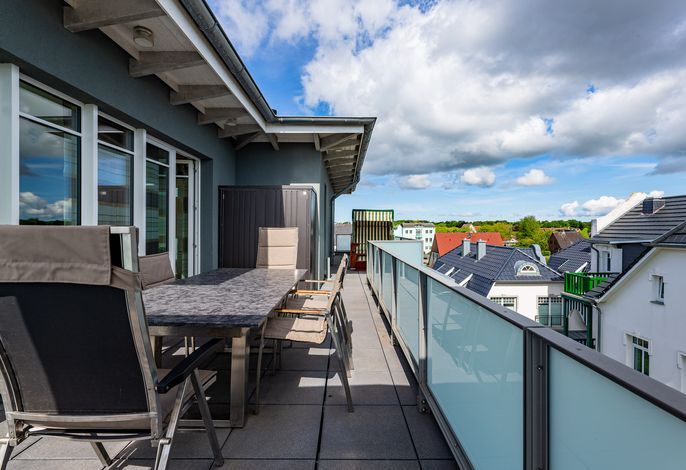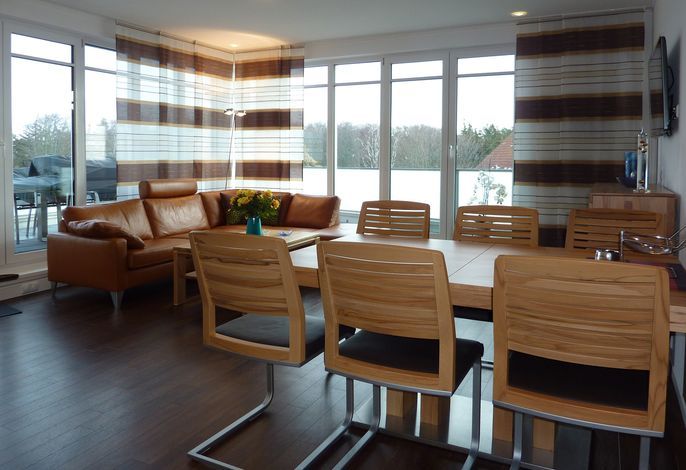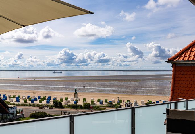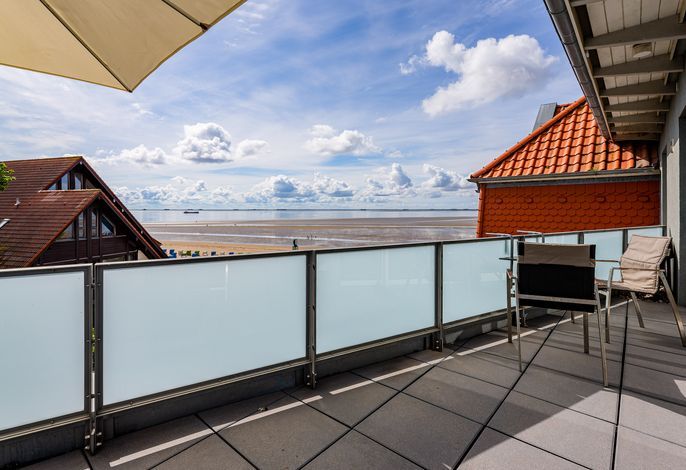 Wir begrüßen Sie im Schloß am Meer, der exklusiven Wohnanlage direkt am Wyker Südstrand gelegen. Ihre Wohnung liegt im Staffelgeschoss. Hier haben Sie eine große Dachterrasse für sich und einen Blick auf die Nordsee und die...