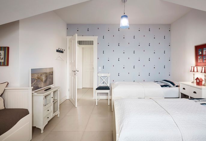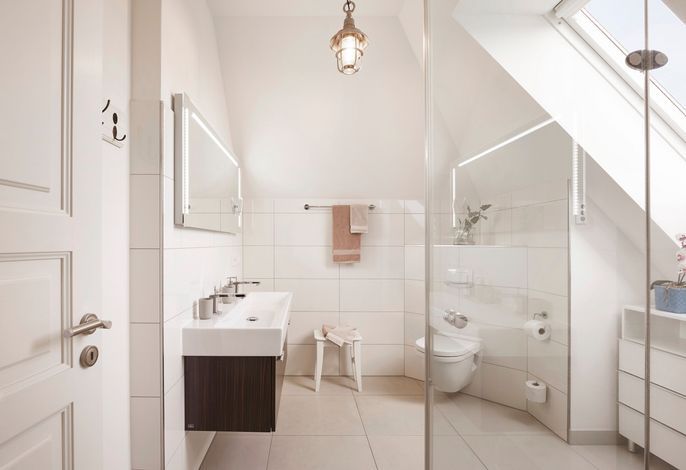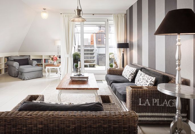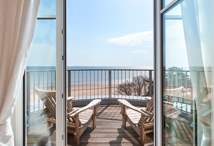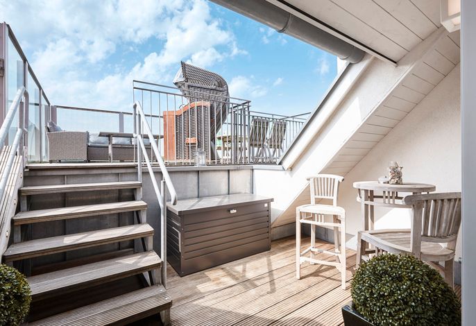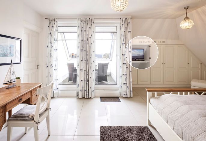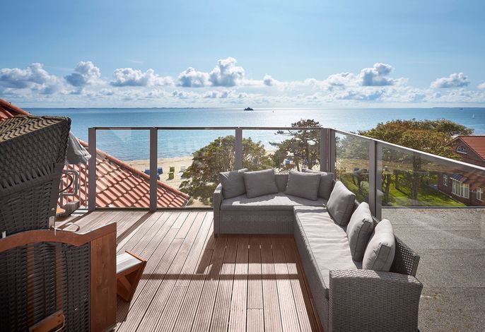 Wir begrüßen Sie im Schloss am Meer, der exklusiven Wohnanlage direkt am Wyker-Südstrand gelegen. Ihre Penthouse Wohnung liegt im 4. Obergeschoss hinter der historischen Fassade, welche beim Neubau erhalten wurde. Hier laden zwei Dachterrassen und eine Loggia ein, den Blick auf die Nordsee und den Halligen zu genießen. Ein einzigartiger Panoramablick erwartet Sie. Genießen Sie die Sonne schon beim Frühstück! In nur wenigen Schritten befinden Sie sich auf der Promenade, die Sie ins Herz von Wyk führt. Hier laden Geschäfte zum Bummeln ein, Cafes und Restaurants verwöhnen Sie mit kulinarischen Köstlichkeiten.
