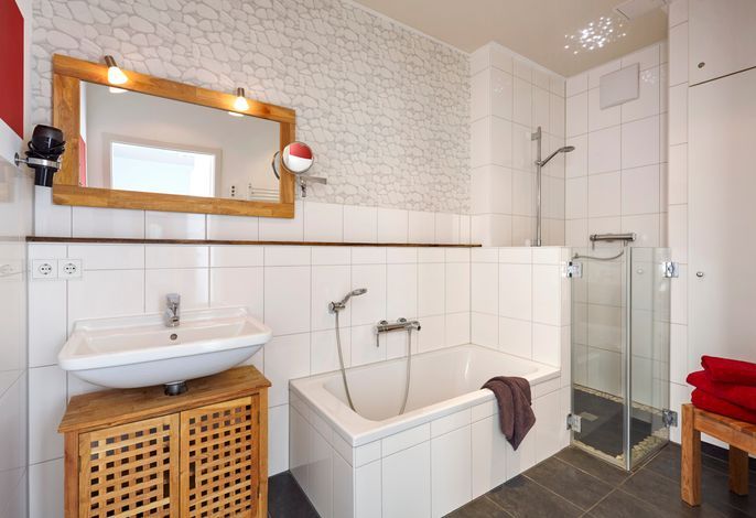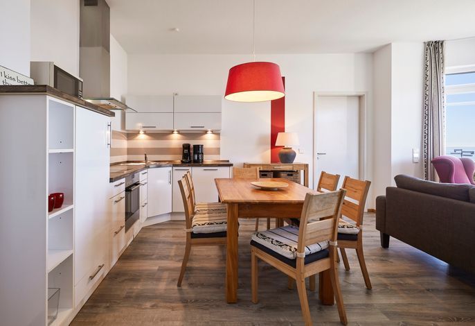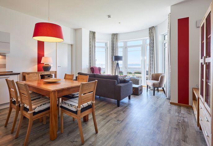 Wir begrüßen Sie im Schloss am Meer, der exklusiven Wohnanlage direkt am Wyker Südstrand gelegen. Ihre Wohnung liegt Hochpaterre hinter der historischen Fassade, welche beim Neubau erhalten wurde. Hier laden drei Balkone ein, den Blick auf die Nordsee und die Halligen zu genießen. Ein einzigartiger Panoramablick erwartet Sie. Genießen Sie die Sonne schon beim Frühstück! In nur wenigen Schritten befinden Sie sich auf der Promenade, die Sie ins Herz von Wyk führt. Hier laden Geschäfte zum Bummeln ein, in Cafés und Restaurants werden Sie mit kulinarischen Köstlichkeiten verwöhnt.