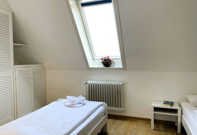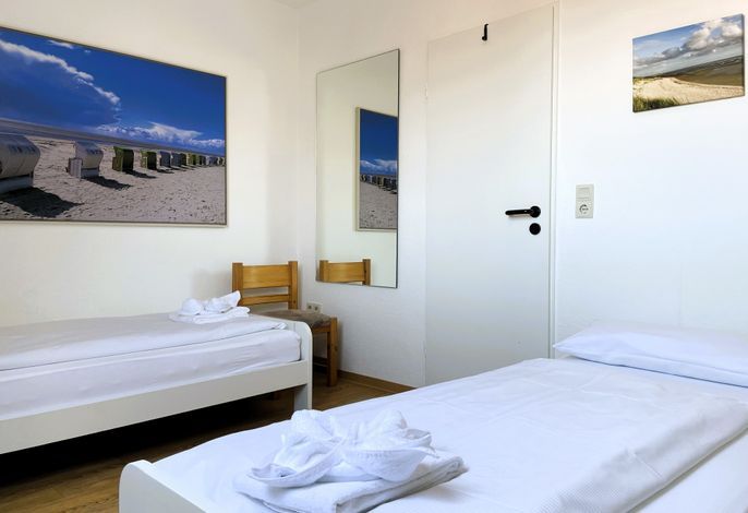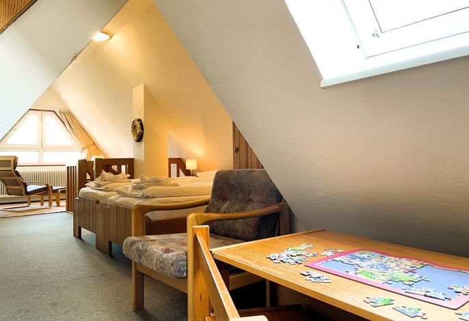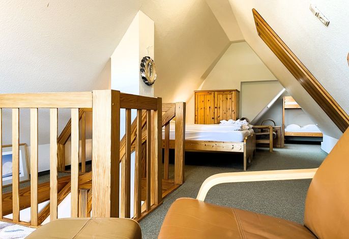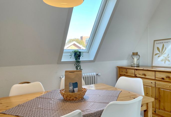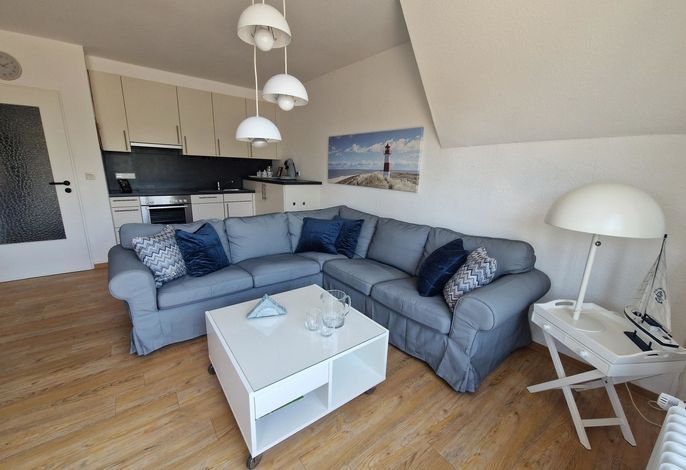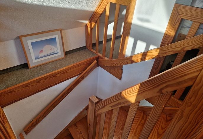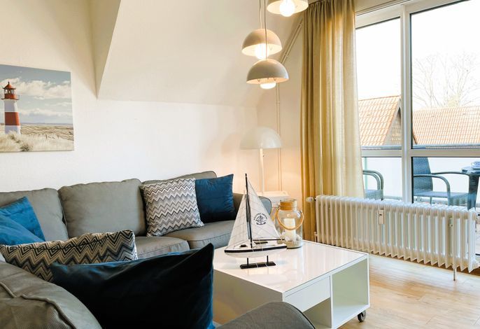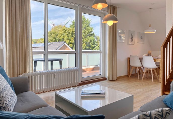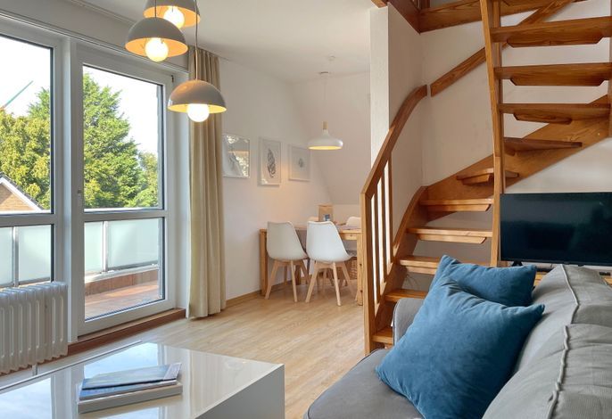 Unser Seeadler 14 ist eine helle Maisonette-Wohnung in der beliebten Anlage Seeadler am Sandwall - unweit der Wyker Innenstadt. Genießen Sie herrliche Urlaubstage in dieser charmanten Wohnung. Maritime Accessoires geben der Wohnung ihren nordfriesischen Charme. Im zweiten Stock befindet sich der Wohnraum mit einer bequemen Couch, einer integrierten Essecke und einer gut ausgestatteten Küchenzeile. Das Bad ist mit Dusche ausgestattet. Im Schlafzimmer laden zwei Einzelbetten zum Ausschlafen ein. Auf der offenen dritten Etage befindet sich neben einer Leseecke mit Blick auf die Wyker Mühle und ein Doppelbett zum Träumen. Direkt angrenzend steht ein Etagenbett und ein Maltisch für die Kleinen bereit. Im Sommer können Sie auf dem Balkon relaxen, der von ca. Mai bis September mit Gartenmöbeln ausgestattet ist. Schauen Sie gleich nach freien Zeiten in unserem Seeadler 14 und buchen Sie Ihre erholsame Föhrer Auszeit!