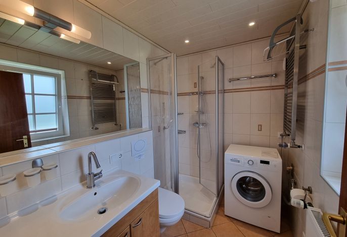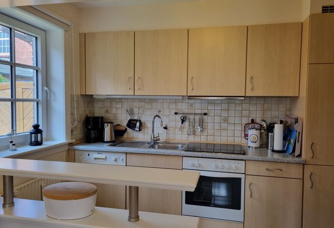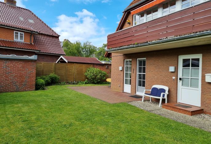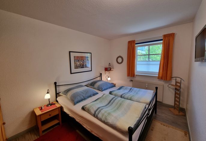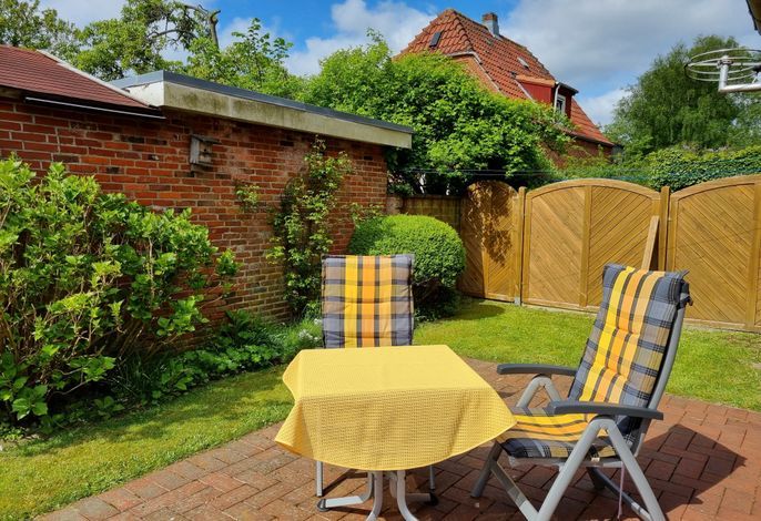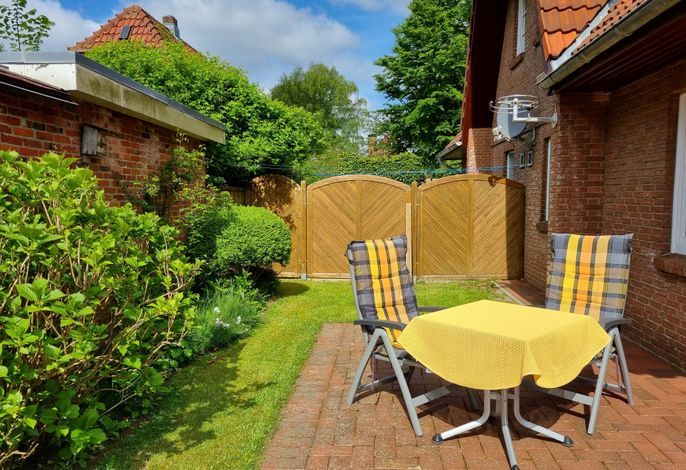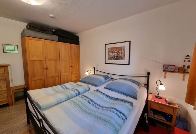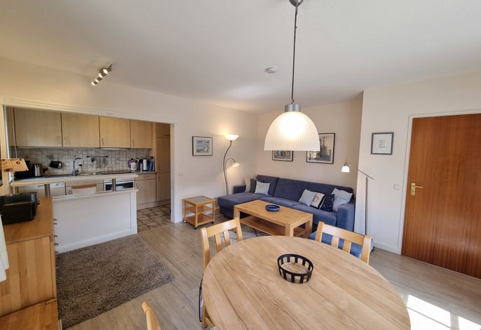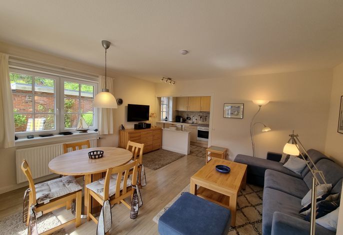 Die ca. 50 m² große und gemütliche Ferienwohnung bietet Platz für 2 Personen. Diese Wohnung ist eine von vier Wohneinheiten im Haus und befindet sich auf der Rückseite des Hauses. Der helle offene Wohnbereich integriert eine moderne Einbauküche mit sämtlichem Komfort für Selbstversorger, gemütlichen Essbereich und eine Kuschel-Sitzecke. Im Badezimmer befindet sich eine Dusche, WC und ein großzügiges Waschbecken mit Ablagefläche, sowie eine Waschmaschine, ein Handtuchhalter und Föhn. Im Schlafzimmer befindet sich ein Doppelbett in der Größe 1,80 × 2,00 m und geschlossenen Fußende und ein großzügiger Kleiderschrank. Auf der eigenen Terrasse können Sie entspannt in den Tag starten und die Sonne genießen. Ihre Fahrräder können Sie unter dem gemeinsamen Fahrradunterstand abstellen.
