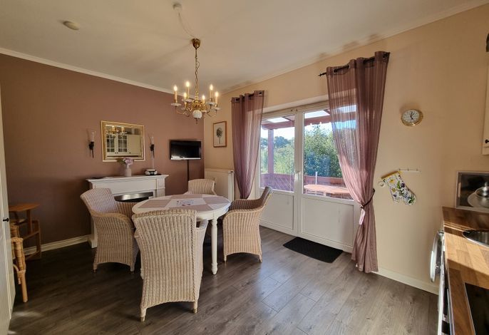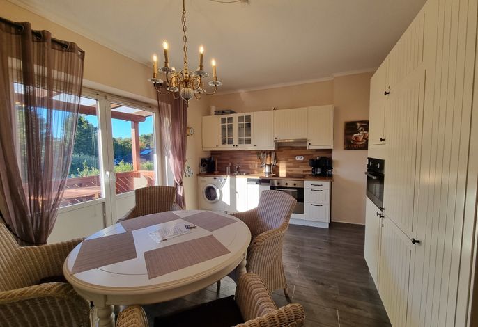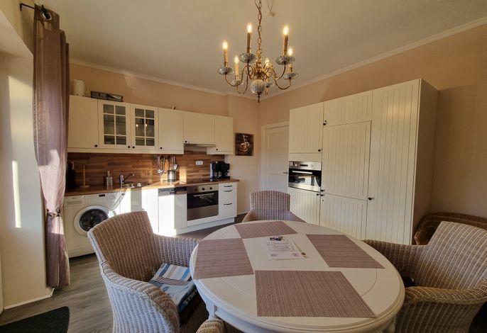 In der voll ausgestatteten Küche finden Sie alles, was Sie zum Kochen benötigen. Von hier aus gelangen Sie direkt auf den schönen Balkon, auf dem Sie die Ruhe genießen und entspannt in den Tag starten können. Ein Waschtrockner steht Ihnen ebenfalls zur Verfügung.