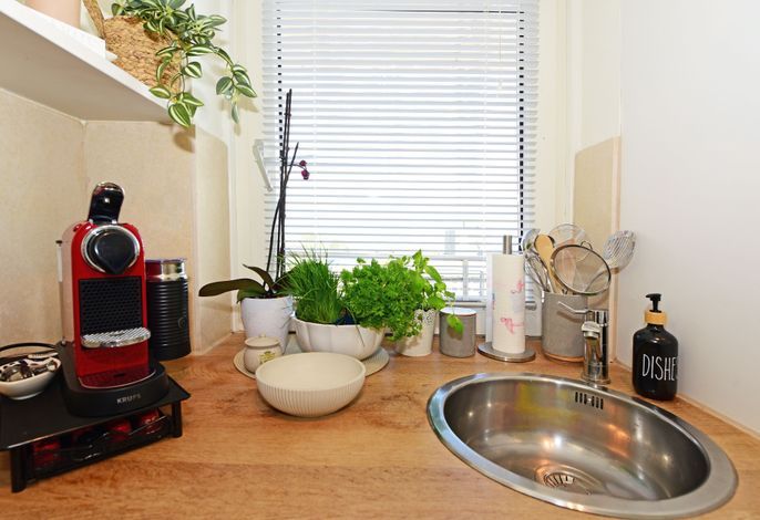 Die Wohnung bietet Platz für zwei Personen und ist mit einem komfortablen Doppelbett (160x200 cm) ausgestattet. Ein bequemes Sofa lädt zum Verweilen ein – ideal für gemütliche Abende mit einem Flachbildschirm für Ihre Unterhaltung. Außerdem gibt es eine Bücherecke und WLAN ist natürlich auch vorhanden. Die Küche bietet einen Blick auf das bunte Treiben im Hafen.