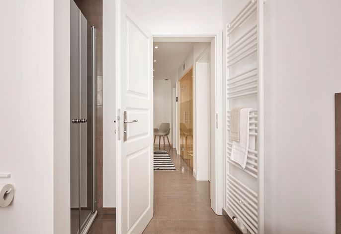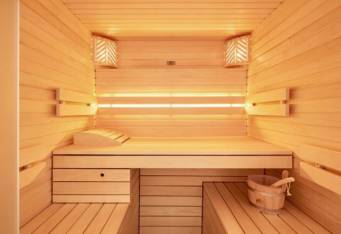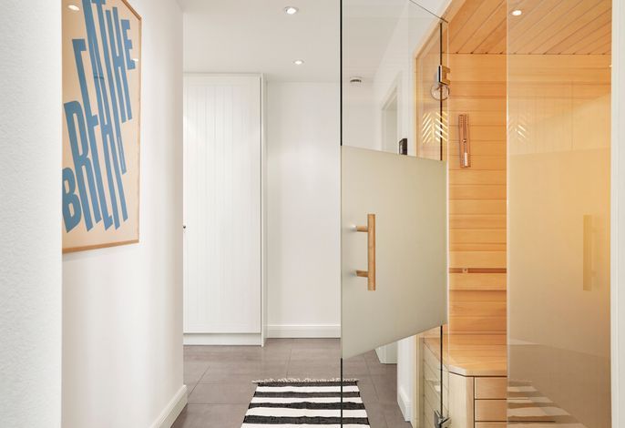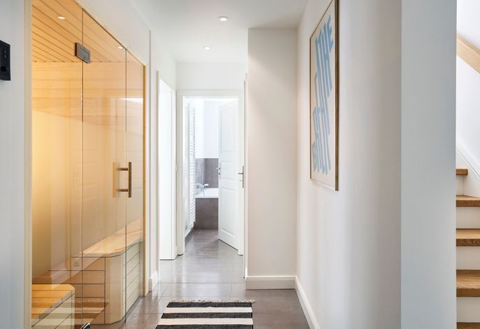 Im Untergeschoss befindet sich eine Saune mit Glasfront. Diese lädt – gerade im Winter – zu einem Wellnesstag ein. Ein großes Duschbad ist gleich nebenan. Zusätzlich gibt es noch ein Zimmer zum Relaxen und - falls man im Urlaub wirklich mal arbeiten muß – einen Schreibplatz.