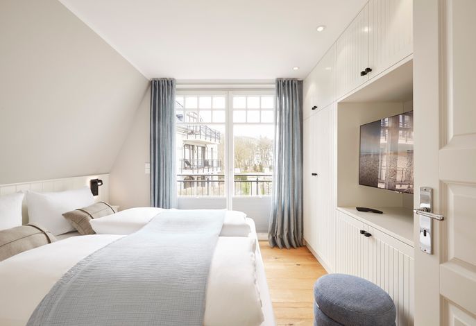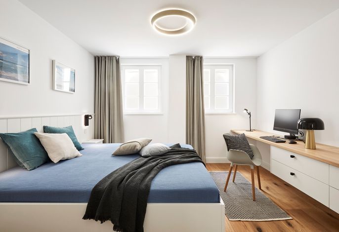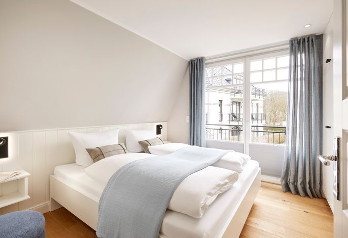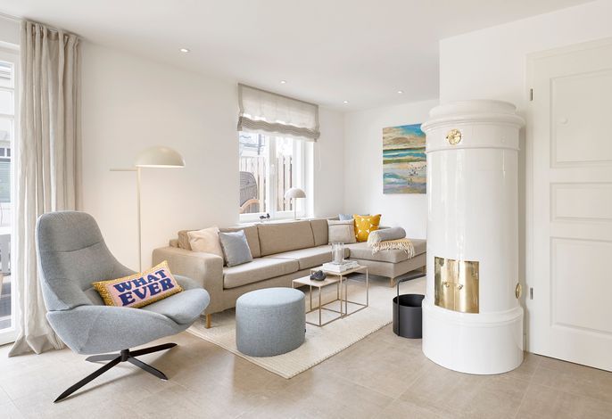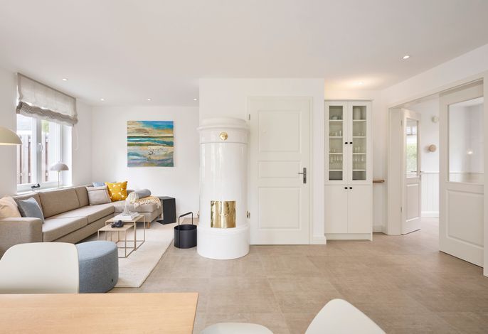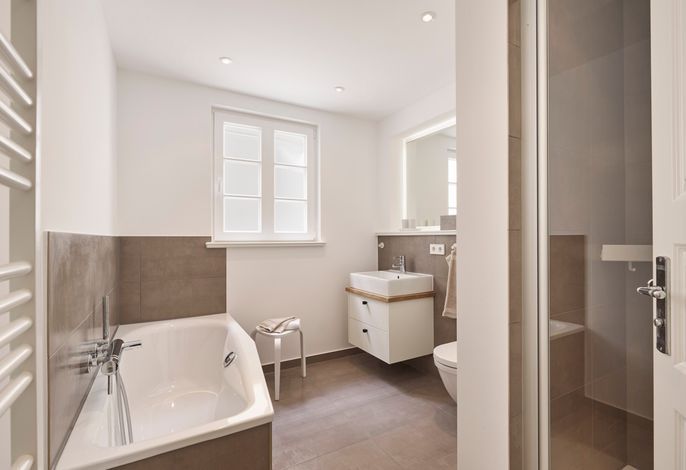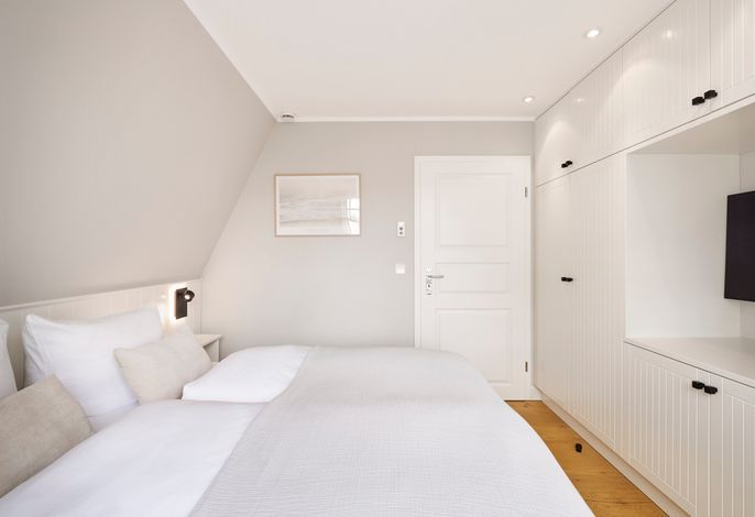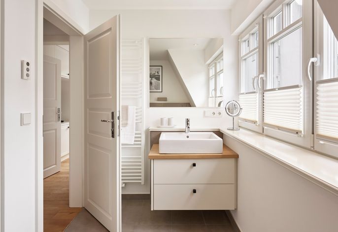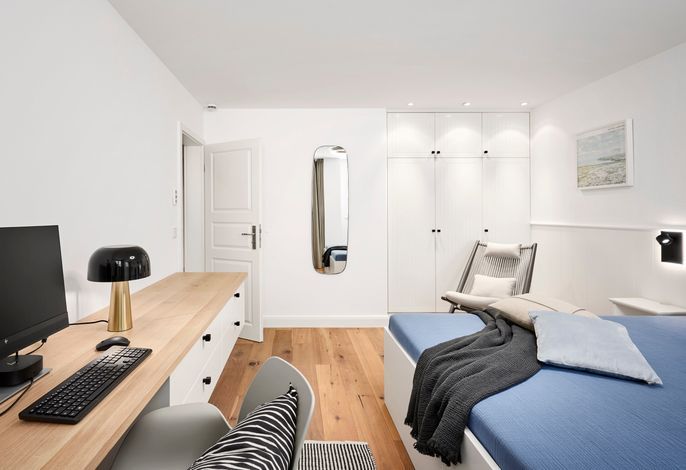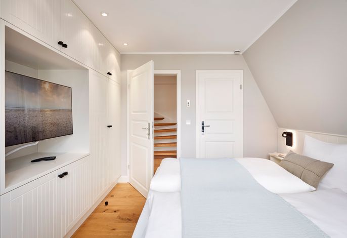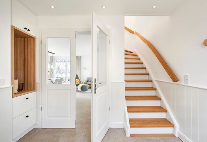 Im Sommer können Sie schon morgens Ihr Frühstück auf der Terrasse genießen und die Meeresbrise spüren. Im Obergeschoss befinden sich zwei Doppelbettschlafräume und ein Duschbad. Aus einem der Schlafräume können Sie sogar einen Blick auf die Nordsee erhaschen. An beiden Schlafzimmern gibt es einen kleinen Balkon, für den ersten Kaffee am Morgen oder ein Glas Wein am Abend.