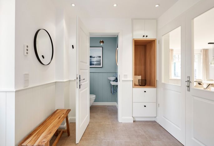 Wir begrüßen Sie in der Strandbude – eine schöne und moderne Ferienhaushälfte in unmittelbarer Nähe zum Strand.Beim Betreten empfängt Sie ein heller uns geräumiger Windfang vom dem aus Sie direkt auch in das Gäste WC im...