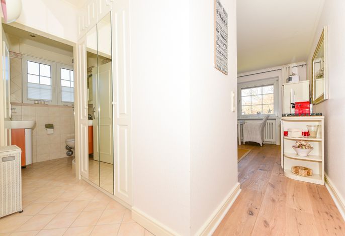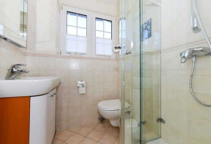 Ein großzügiger Einbauschrank sorgt für ausreichend Platz für Ihre Urlaubsgarderobe, und das Duschbad, mit einem Außenfenster, ist lichtdurchflutet und freundlich.