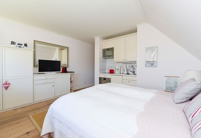 Auf 22 m² finden bis zu 2 Personen alles, was für einen entspannten Urlaub nötig ist, inklusive Meerblick und einem eigenen Strandkorb im Garten, der zu ruhigen Stunden unter freiem Himmel einlädt.