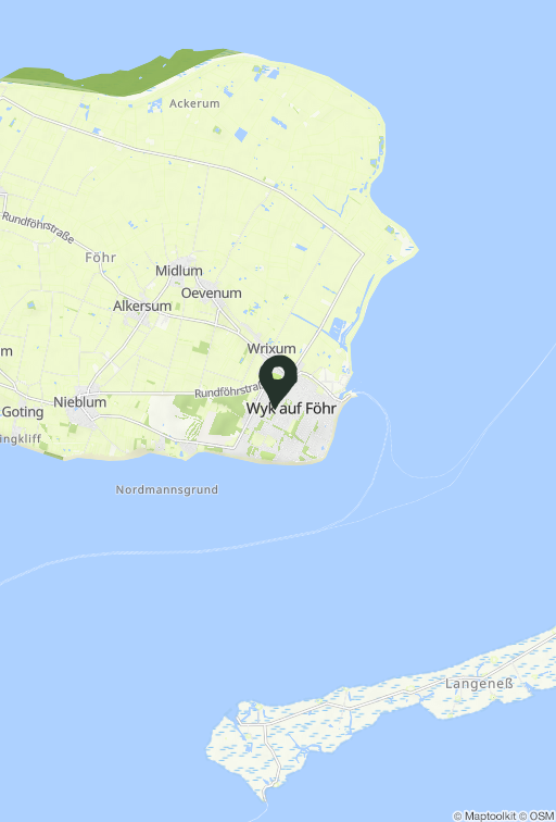 Zum Zentrum von Wyk sind es ca. 15 Gehminuten, zum Südstrand ca. 600 m, zum Bäcker ca.170 m.