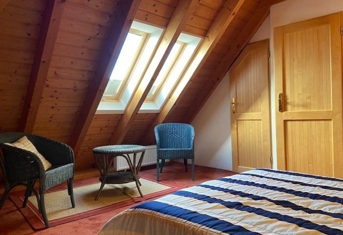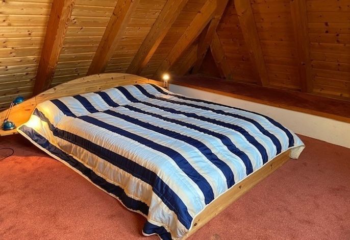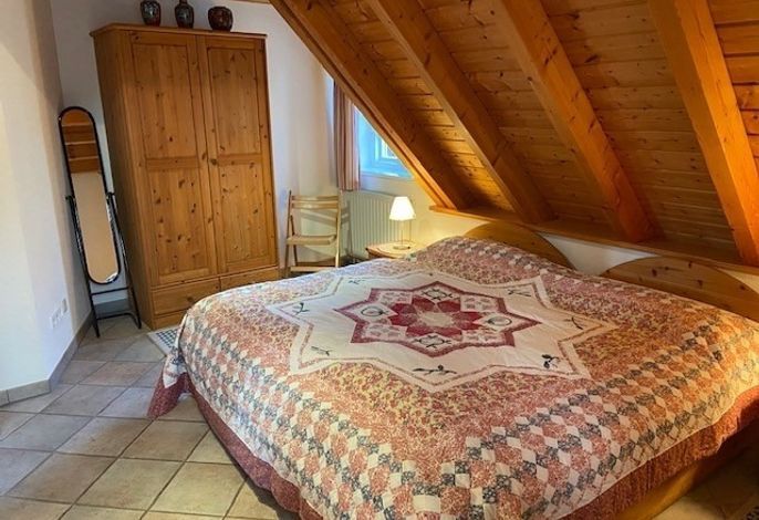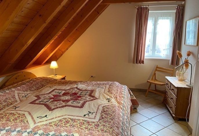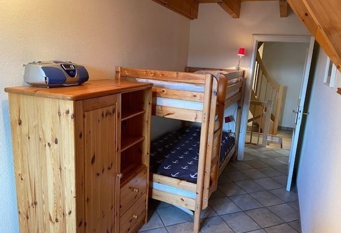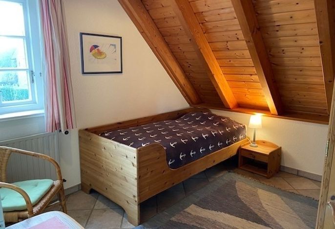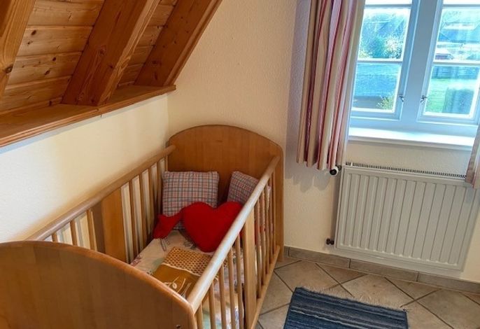 Das dritte Schlafzimmer verfügt über ein Etagenbett (für Kinder) und ein Babybett. Ein weiteres gemütliches Schlafzimmer im Dachgeschoss des Hauses verfügt über ein Doppelbett (140 x 200), welches bei sonnigem Wetter einen Blick auf die Nachbarinsel Amrum bietet.
