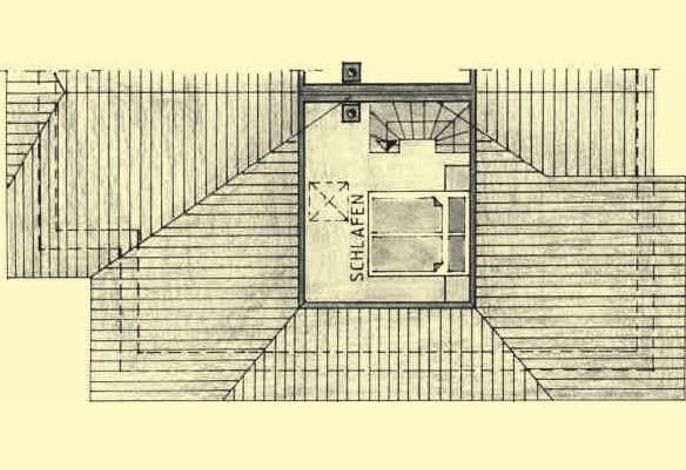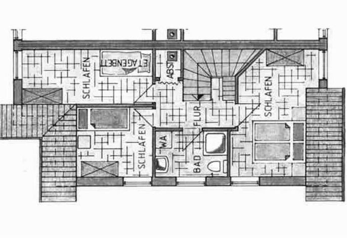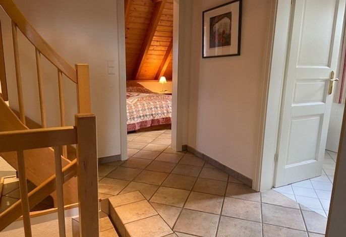 In der ersten Etage liegen drei Schlafzimmer. Eines mit zwei aneinander geschobenen Einzelbetten und ein weiteres mit einem Einzelbett.