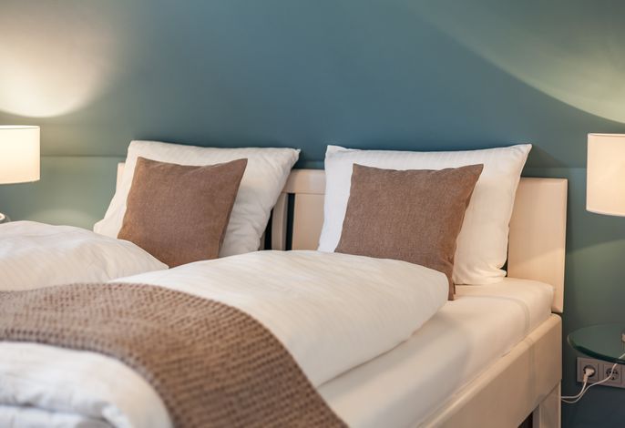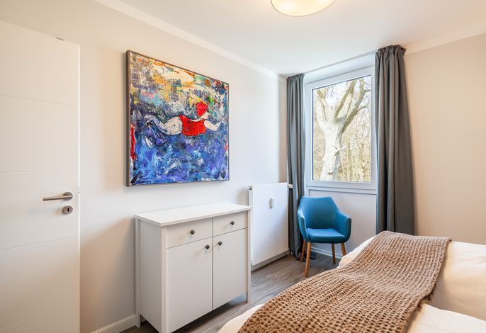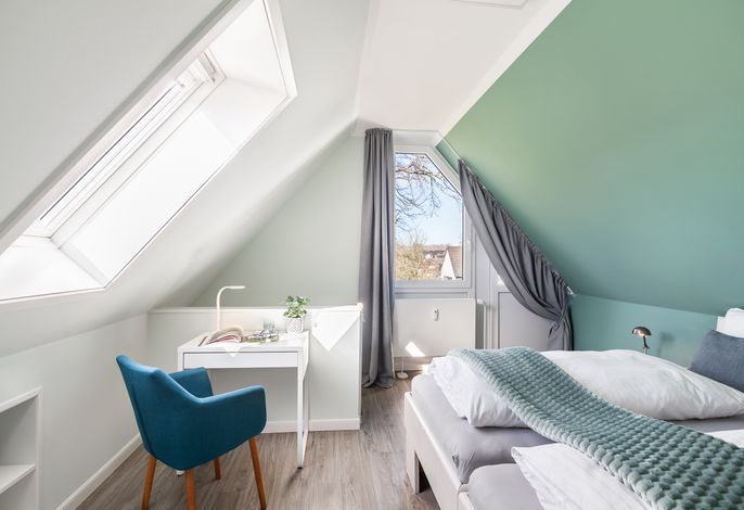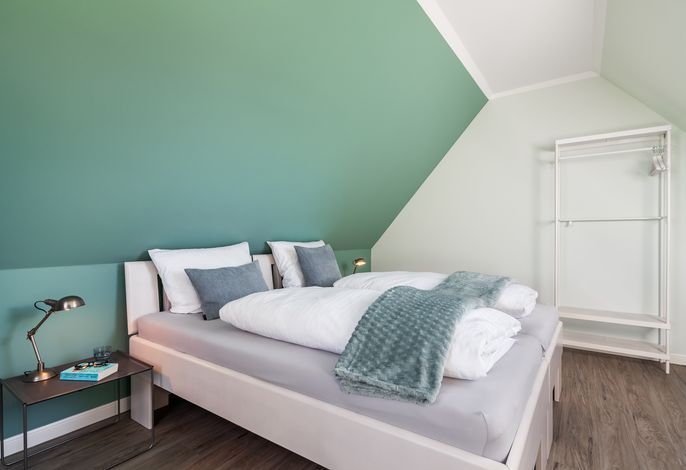 Es sind zwei Schlafzimmer vorhanden, einmal ein Schlafzimmer mit Doppelbett[nbsp]und ein weiteres Schlafzimmer mit Einzelbetten (können auch zum Doppelbett gestellt werden) im großzügigen Dachgeschoss. [nbsp]Im Keller des Hauses befinden sich Waschmaschine und Trockner, die über Münzer mit benutzt werden können.