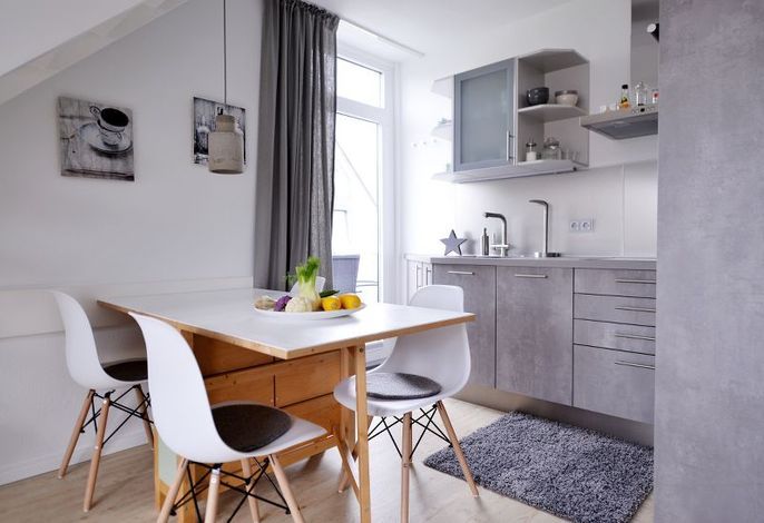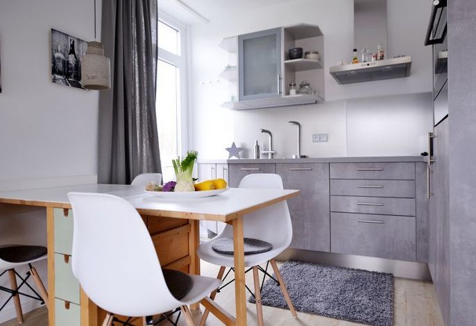 Der freundliche Wohnraum mit einer modernen Sitzgruppe (Sat-TV, DVD-Player, CD-Stereoanlage, Telefon und Internetanschluss ) und einem Esstisch macht den Aufenthalt noch angenehmer. Eine schicke Küchenecke in Betonoptik mit E-Herd, Backofen, Kühlschrank sowie Geschirrspülmaschine lässt keine Wünsche offen.