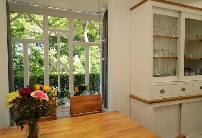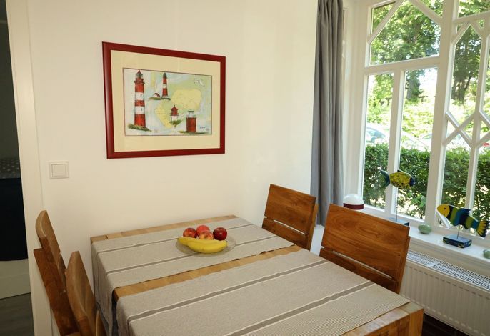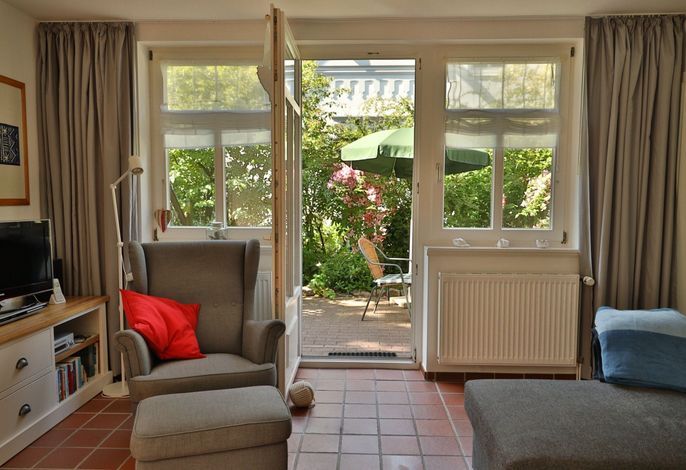 Unsere ca. 50 qm große Erdgeschosswohnung im Haus Gud Tidj erstrahlt seit Anfang 2022 im neuen Glanz und bietet bis zu 4 Personen Platz, um herrliche Urlaubstage zu verbringen. Die zentrale Lage in der Badestraße ist der ideale Ausgangsort für Ausflüge. Das Aquafoehr, die Wyker Innenstadt, das Friesenmuseum und der schöne Strand sind in wenigen Minuten zu erreichen. Das einladende Wohnzimmer mit integriertem Essbereich ist der Mittelpunkt der Wohnung und wurde von den Eigentümer zeitgemäß und gemütlich eingerichtet. Neben einem Flachbild- TV, DVD- Player, einer Musikanlage und WLAN finden Sie hier auch einige Gesellschaftsspiele und einen bequemen Lesesessel. Am Wohnbereich angrenzend befindet sich die moderne und gut ausgestattete Küchenzeile mit Ceranfeld und Backofen, Mikrowelle, Geschirrspüler, Wasserkocher und Kaffeemaschine und einer Senseo Maschine. Hier finden Sie alles, was Sie fürs tägliche Kochen benötigen. Des Weiteren verfügt die Wohnung über ein hellgefliestes Bad mit Dusche und Fenster und zwei liebevoll hergerichtete Schlafräume.