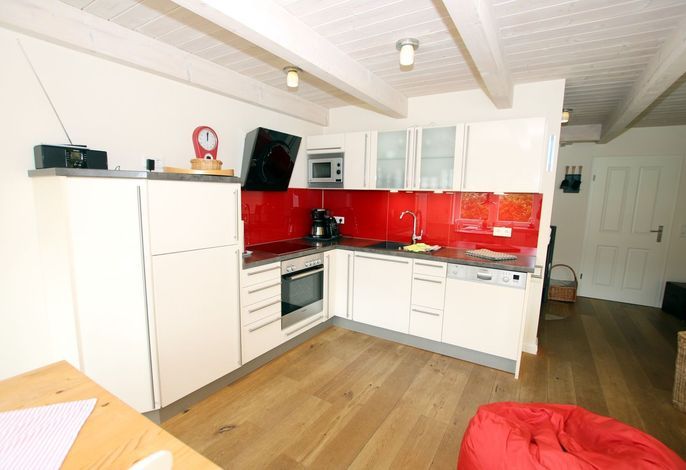WOHNZIMMER: Wohnzimmer mit Küchenzeile, Ledercouch über Eck, Couchtisch, Smart-TV, Esstisch mit 5 Stühlen, Küchenzeile mit viel Komfort. SCHLAFZIMMER 1: im EG mit 2 Einzelbetten ( können auch zusammen gestellt werden) und eingebautem Kleiderschrank. FLUR: Garderobenschrank.