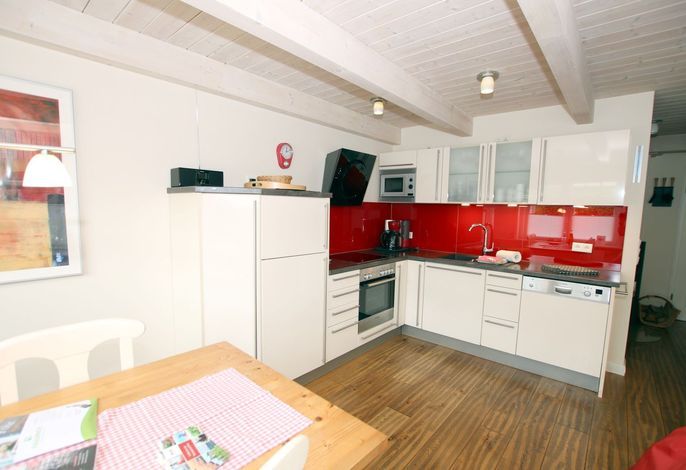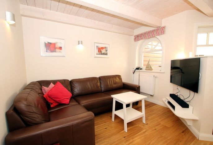 WOHNZIMMER: Wohnzimmer mit Küchenzeile, Ledercouch über Eck, Couchtisch, Smart-TV, Esstisch mit 5 Stühlen, Küchenzeile mit viel Komfort. SCHLAFZIMMER 1: im EG mit 2 Einzelbetten ( können auch zusammen gestellt werden) und eingebautem Kleiderschrank. FLUR: Garderobenschrank.