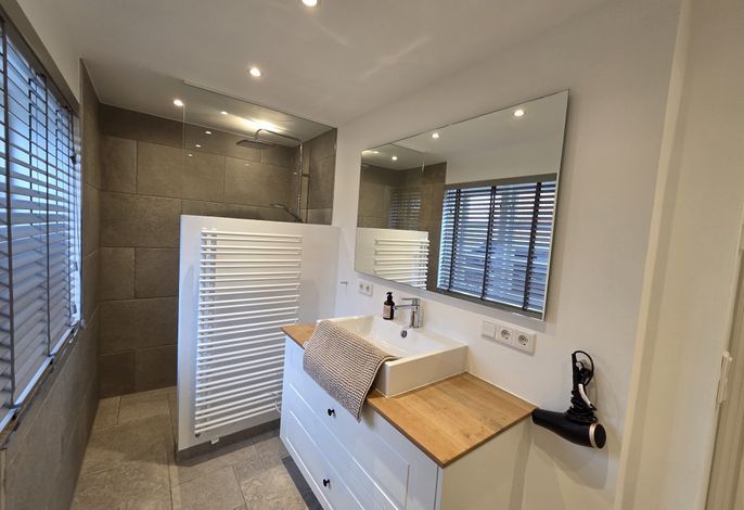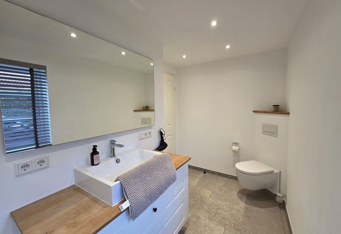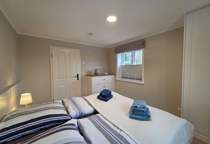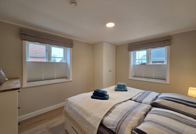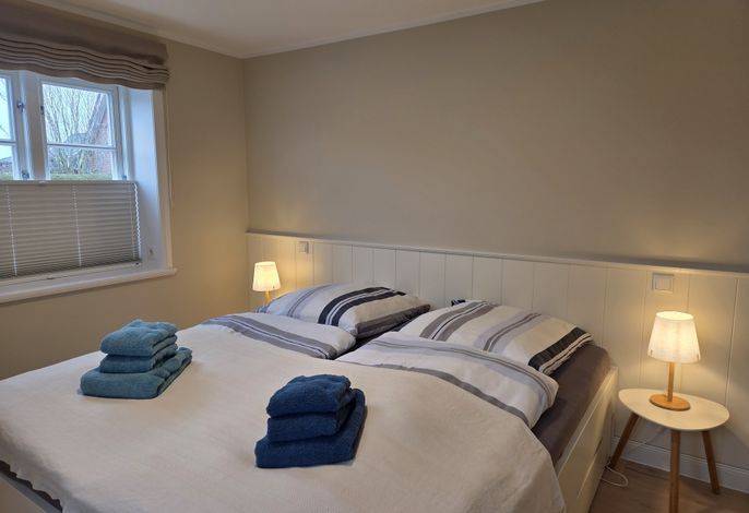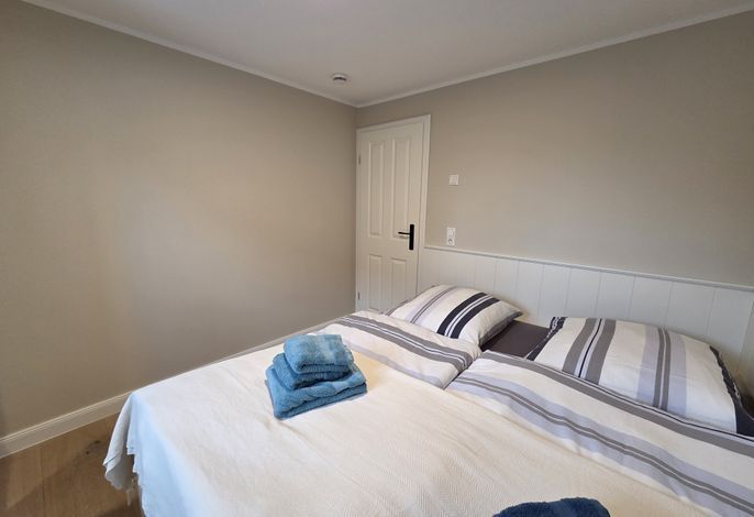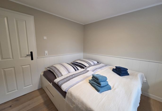 Die Ferienwohnung verfügt über zwei Schlafzimmer, jeweils mit komfortablem Doppelbett (180 × 200 cm) und Kleiderschrank, die für erholsamen Schlaf sorgen. Das moderne Bad mit Dusche/WC ist funktional ausgestattet, zusätzlich stehen Haartrockner sowie Waschmaschine und Trockner zur Verfügung.
