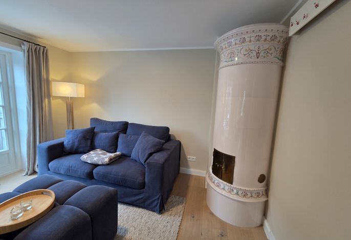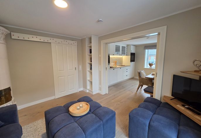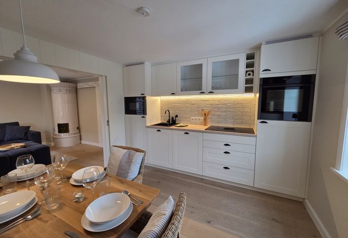 Der gemütliche Wohnbereich lädt mit Sofa, Kaminofen, Sat-Flat-TV und großem Esstisch zu entspannten Stunden ein. Die separate Küche ist voll ausgestattet und verfügt unter anderem über Backofen, Cerankochfeld, Geschirrspülmaschine, Mikrowelle, Kühlschrank mit Gefrierfach, Kaffeemaschine, Wasserkocher und Toaster – ideal für die Selbstversorgung im Urlaub.