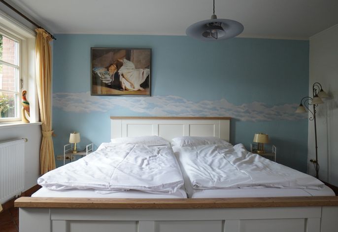 Das gemütliche, lichtdurchflutete Elternschlafzimmer mit einem komfortablen Doppelbett sowie großzügigem Kleiderschrank bietet direkten Zugang zu einer kleinen, aber charmanten Etagenkoje (160 x 70cm) - ein kuscheliger Schlafplatz für Kinder.
