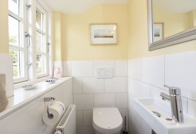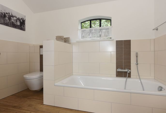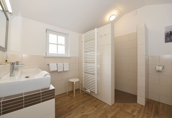 Ein weiteres Highlight des Erdgeschosses ist das stilvolle Dusch-Wannenbad im hinteren Hausteil, das mit besonderen Details wie antiken gußeisernen Stallfenstern begeistert. Diese liebevollen Akzente finden sich im gesamten Haus und machen den Aufenthalt zu etwas ganz Besonderem.