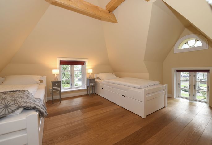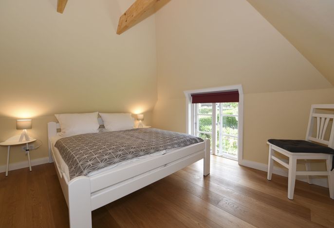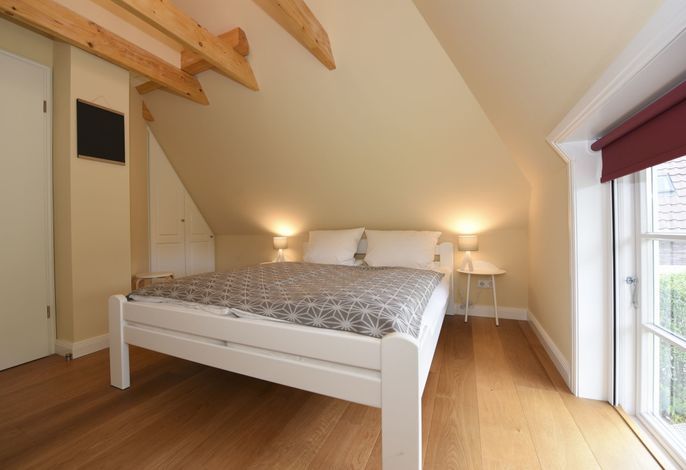 Im Obergeschoss erwarten Sie zwei geschmackvoll eingerichtete Schlafzimmer mit bodentiefen Holzflügelfenstern, die für viel Tageslicht und eine gemütliche Atmosphäre sorgen.
