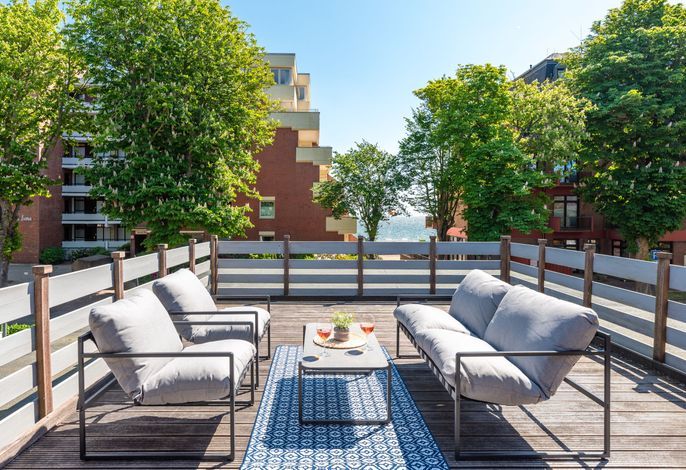 Topmoderne und 2024 ausgestattete Ferienwohnung in zweiter Reihe mit Meerblick und Strandzugang vor dem Haus. Im Erdgeschoss befinden sich der Eingangsbereich mit Garderobe sowie Waschmaschine und Trockner. Im Obergeschoss...