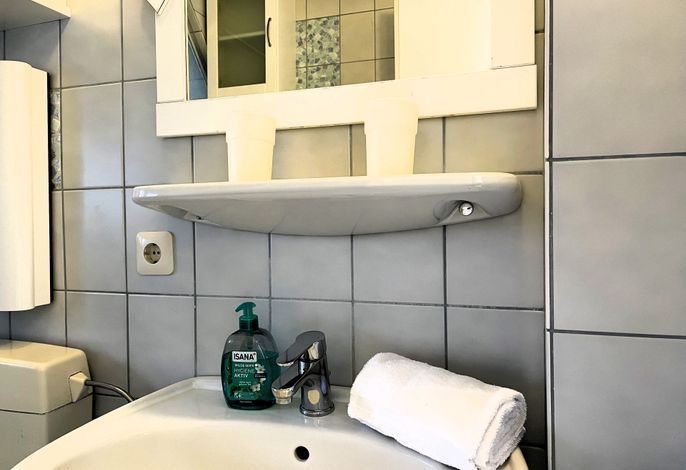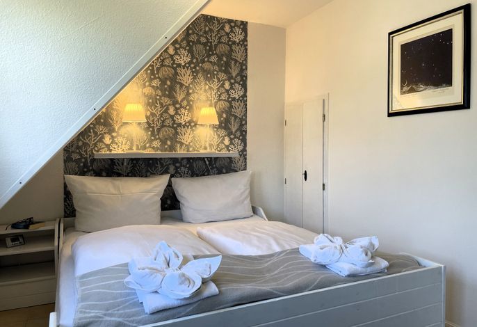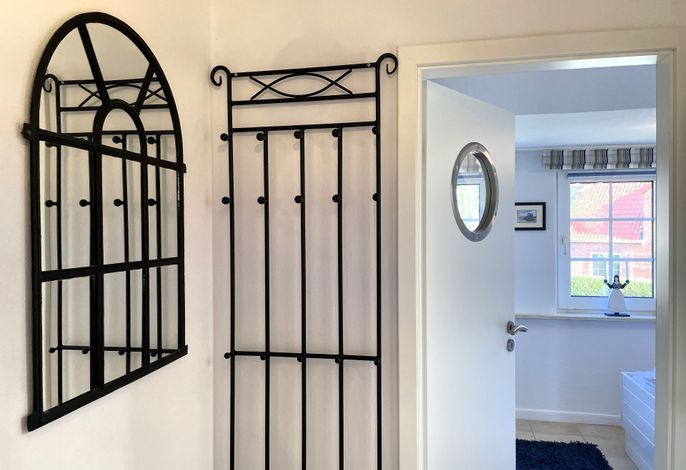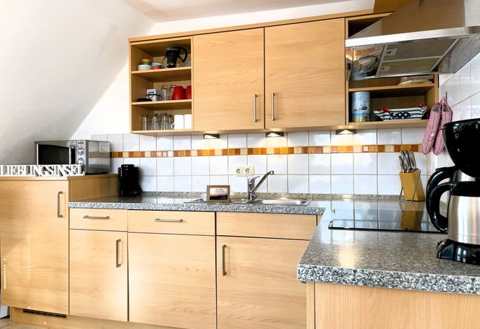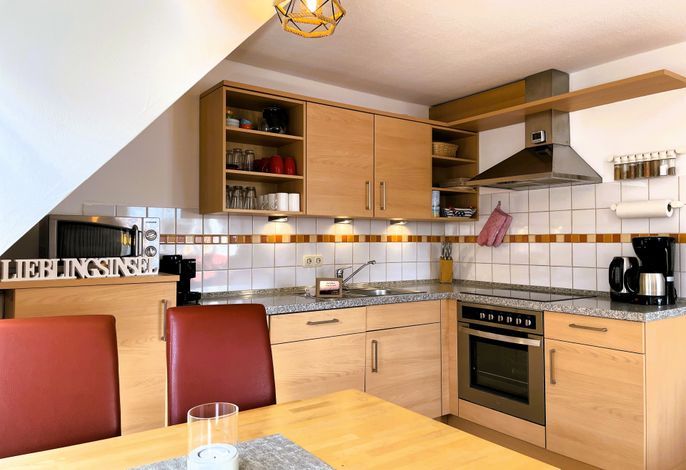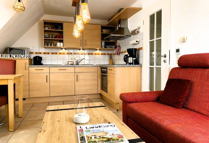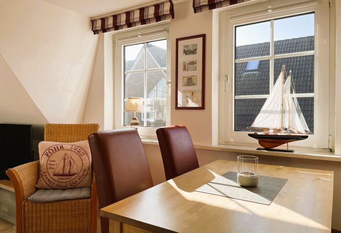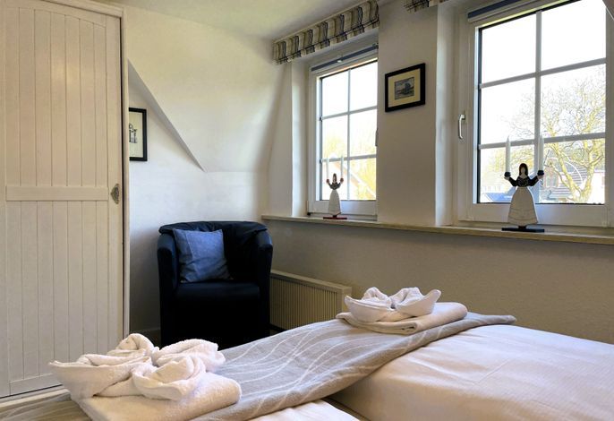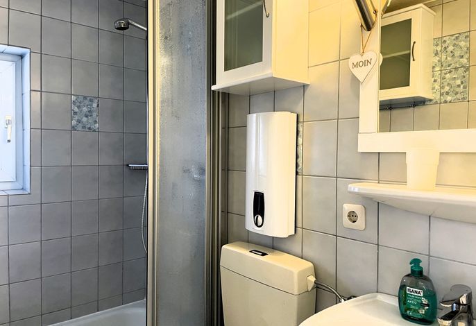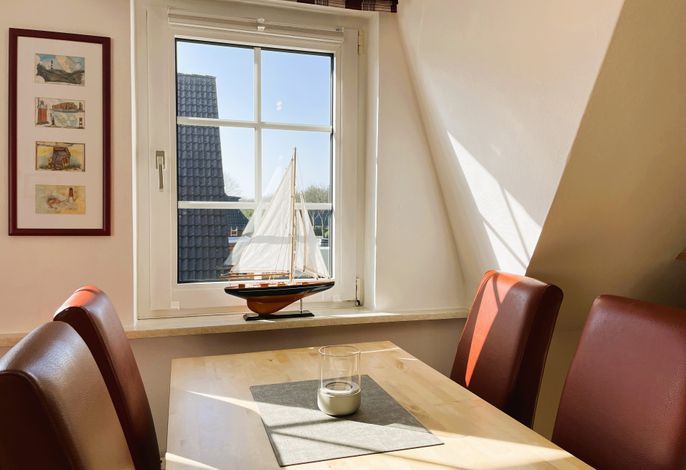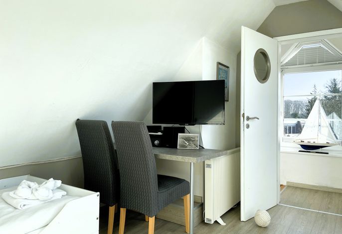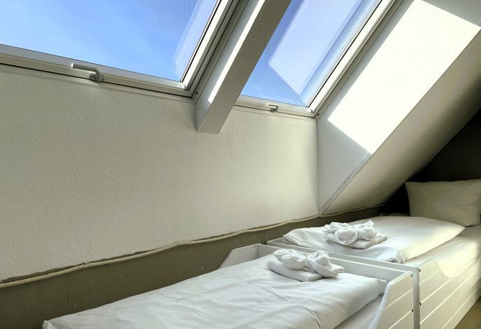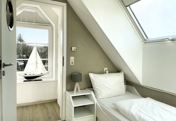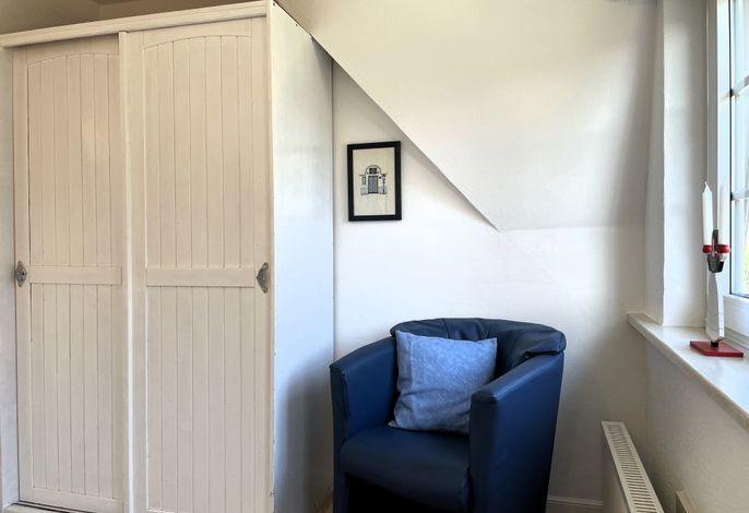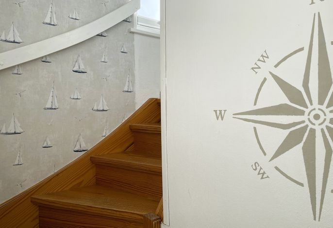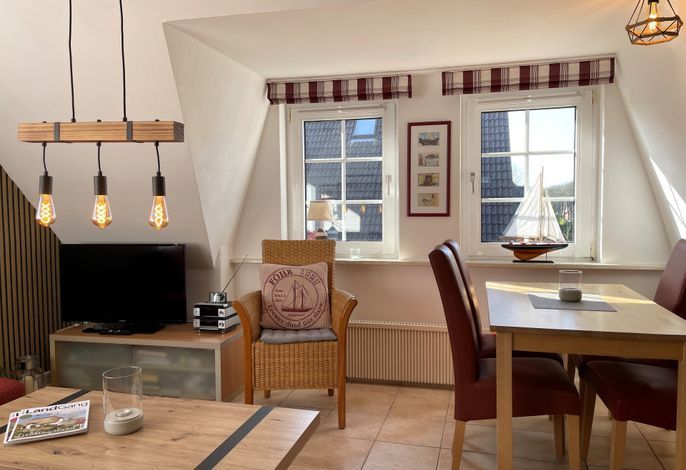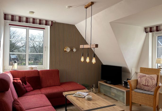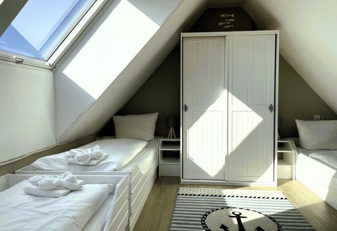 Die lichtdurchflutete Wohnung verteilt sich auf 2 Etagen. Im 1. Obergeschoss befinden sich das liebevoll mit kleinen Details dekorierte Wohnzimmer, eine gut ausgestattete Küchenzeile mit Essbereich, ein Badezimmer mit Dusche und ein gemütliches Schlafzimmer mit Doppelbett (160x200 cm) und Kleiderschrank. Über eine robuste Treppe geht’s ins Dachgeschoss. Drei Einzelbetten (90x200cm), ein Kleiderschrank und ein Schreibtisch sowie ein zusätzlicher Fernseher stehen für Sie bereit. Maritim eingerichtet präsentiert sich dieser Raum nicht nur als Schlafraum sondern auch als Wohlfühlraum, wenn Sie sich mal zurückziehen wollen. Für Schietwedder-Tage haben wir für die Großen und Kleinen Gesellschaftsspiele, Bücher, Kabel TV und Stereoanlage, falls mal Langeweile aufkommen sollte.