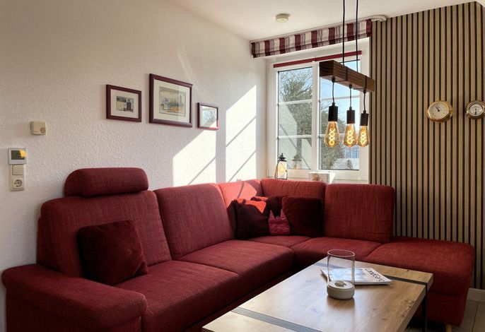 Der komfortable Wohnbereich ist ausgestattet mit WLAN, Kabel-Smart TV, DVD-Player und Stereoanlage.