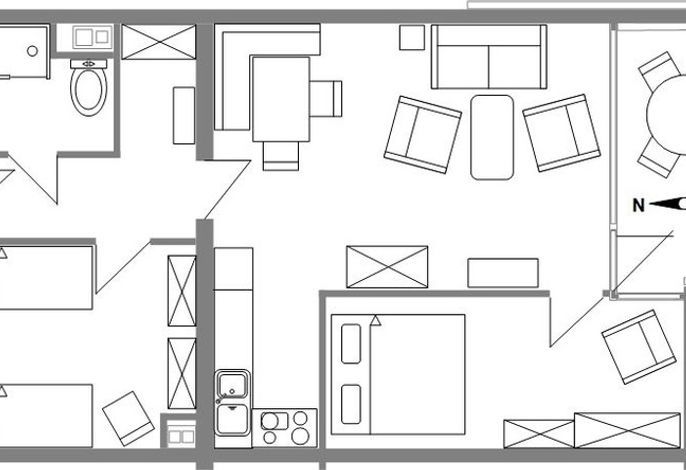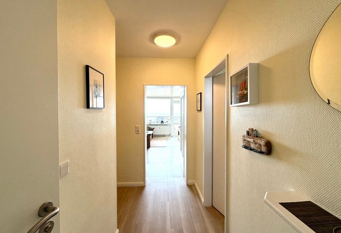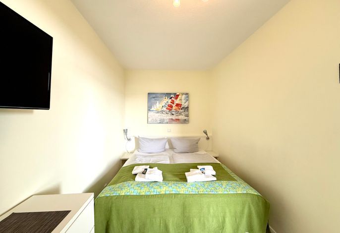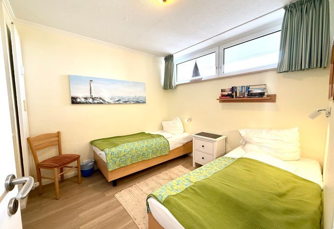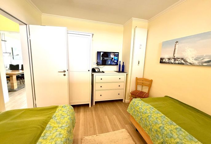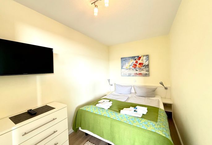 Das Appartement Nr. 14 für max. 4 Personen mit Balkon befindet sich im 2. Obergschoss des Hauses Uthlande und hat direkten Meerblick vom Wohnzimmer und Südbalkon. Hier erwartet Sie ein helles und großzügiges Wohn-Esszimmer. Das Schlafzimmer bietet Platz für zwei Personen im Doppelbett. Ein weiteres geräumiges Schlafzimmer (2 getrennte Einzelbetten) steht Ihnen zusätzlich zur Verfügung. Das Duschbad erfrischt Sie bereits am Morgen. Zur technischen Ausstattung der Wohnung gehören eine moderne Küchenzeile und Flachbildfernseher.